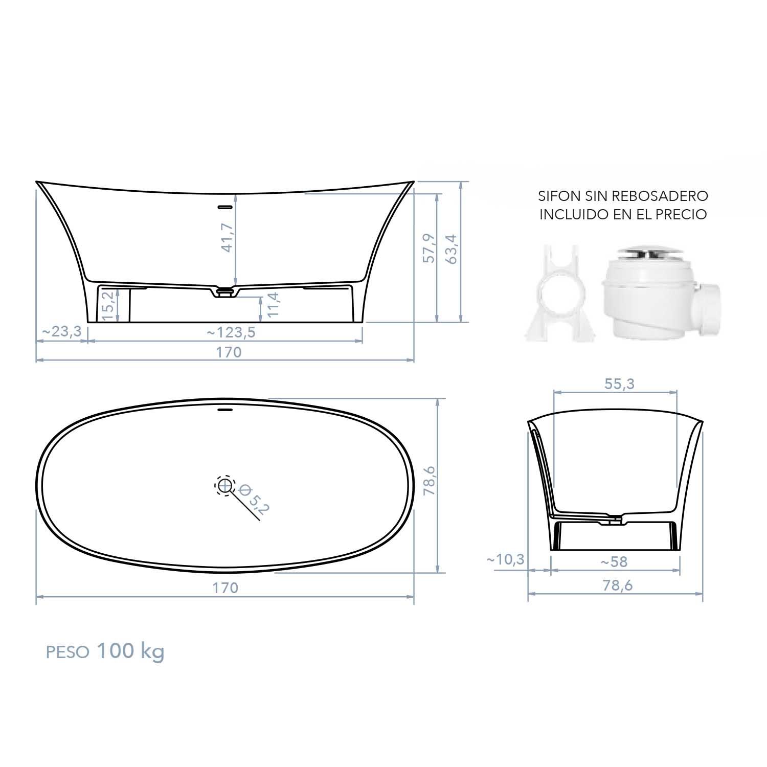 Las bañeras exentas son aquellas que no van encastradas ni son de obra. Podrás apreciar su estructura entera y van apoyadas con toda la base en el suelo.La bañera exenta ALYA ovalada de solid surface tiene una textura sedosa mate muy elegante.Hoy en día se llevan las bañeras blancas mate, no brillantes como las antiguas. Si quieres decorar un baño actual y elegante, no clásico ni vintage, utiliza una bañera de estas.Puedes combinar la bañera exenta Silk ovalada de solid surface con un plato de ducha y una mampara anexas o bien colocar unas bonitas cortinas y usar la bañera como ducha y bañera.En cuanto a la grifería a elegir, tienes dos opciones. Una es colocar la bañera junto a la pared e instalar una grifería mural bimando, en algún color de tendencia. Podría ser dorada, cobriza, negra o blanca, como más te guste.Por otro lado, hay grifos de bañera con instalación a suelo muy elegantes, pero suelen ser más caros. Los hay de caño convencional o tipo cascada, como si estuvieras en un spa.Este modelo mide 170 cm de largo, 78,6 cm de ancho y 63,4 cm de alto. Incluye sifón sin rebosadero y válvula click-clack cromada.El acabado de la bañera puede ser en blanco mate o color a elegir de la carta RAL.STONACRIL SELECTION es un solid surface compuesto por 1/3 de resina acrílica modificada y 2/3 partes de trihidróxido de aluminio(ATH). Es una «superficie sólida» resistente, duradera, y con un tacto muy agradable. Un material que tiene la misma estructura y el mismo color en toda la masa, es decir, cualquier daño en su superficie puede ser fácilmente reparado. Además su superficie sin poros y sin juntas evita la aparición de mohos y humedades. Es utilizado en la Fabricación de encimeras de baño y cocina, así como en la Fabricación de mobiliario, mostradores de recepción …etc.Stonacril es un material ecológico, ya que es reciclable al 100%.RESISTENTEDebido a su composición mineral, 2/3 partes de ATH y un bajo porcentaje de resinas de gran resistencia, STONACRIL ofrece una alta resistencia térmica, así como a los golpes y arañazos.REPARABLESTONACRIL es un material homogéneo. Tiene la misma estructura y el mismo color en toda la masa. Cualquier daño puede ser reparado fácilmenteHIGIENICOSus superficies sin juntas y sin poros, evitan la aparición de mohos y humedades. Es antibacterias.RECICLABLESTONACRIL es un material ecológico al 100%.Cualquier producto fabricado en stonacril puede ser procesado para ser reutilizado de nuevo.MOLDEABLESTONACRIL puede ser trabajado con molde mediante colada, termoconformado… etc., lo que ofrece una gran libertad en el diseño de cualquier pieza.RETROILUMINABLECon diferentes espesores de STONACRIL PLUS, se pude jugar con la luz y conseguir ambientes retroilumidadosRESISTENCIA U.V.STONACRIL PLUS es apto para uso en exteriores, ya que ofrece una alta resistencia a los rayos ultravioleta.LIGEROA pesar de ser un material resistente y duradero, su bajo peso ofrece una gran ventaja en la manipulación y el diseño de piezas, respecto a otro materiales.