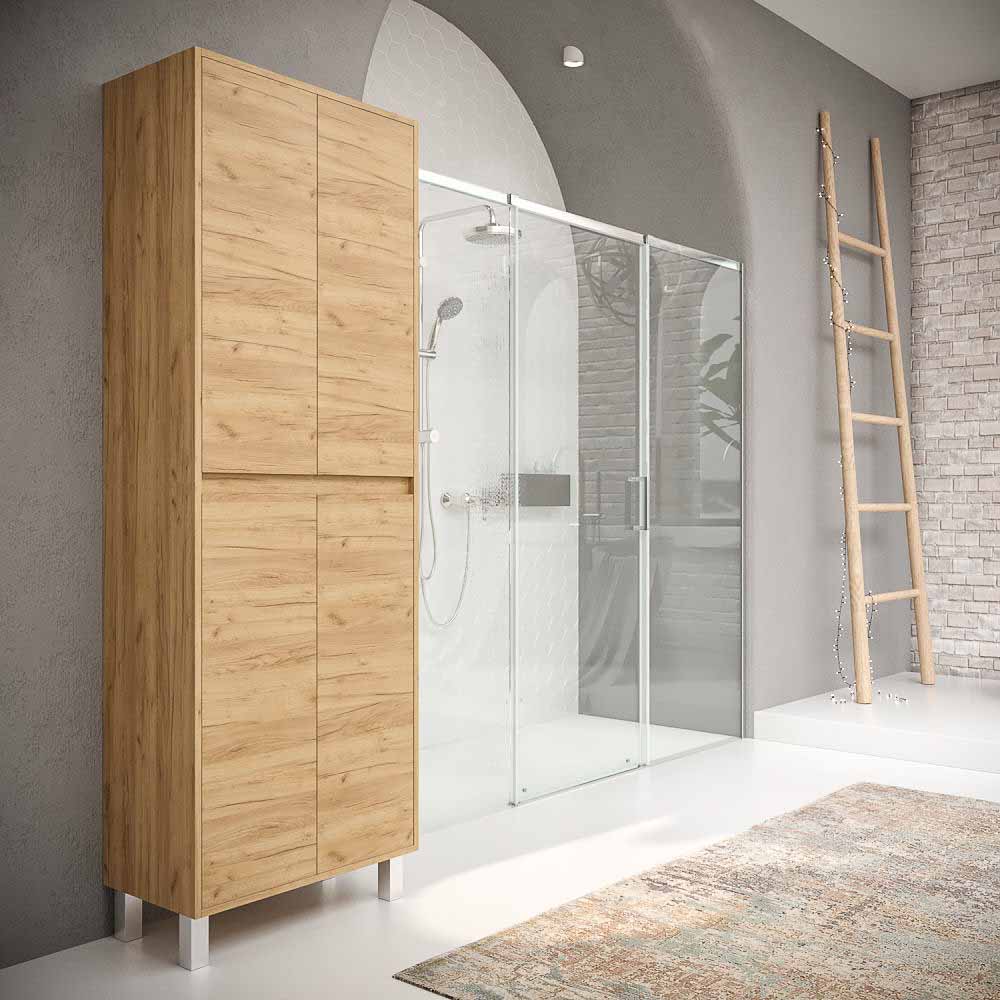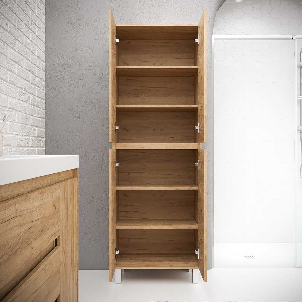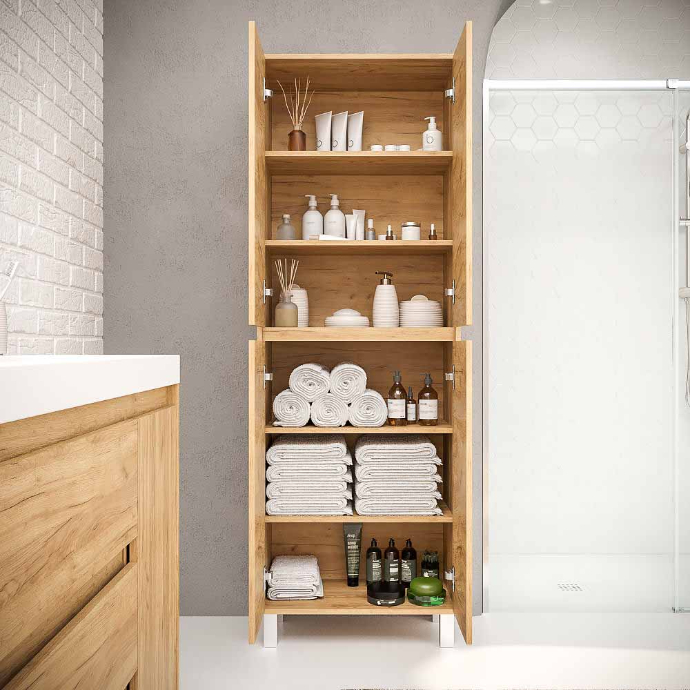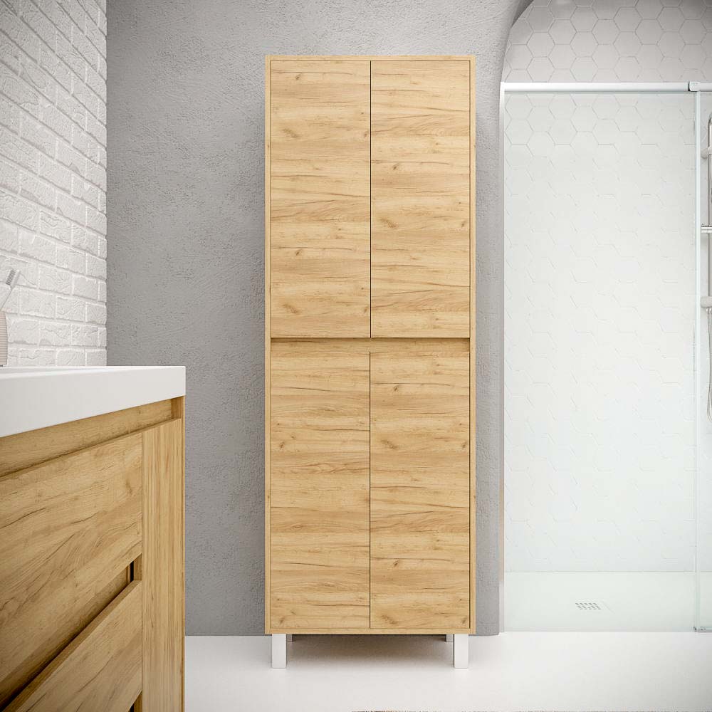 Se trata de una columna de baño elegante y con un diseño atractivo, con variedad de acabados. La opción perfecta para poder dotar a tu baño de un aspecto natural y moderno.Este complemento de baño consta de 2 baldas interiores, lo que te permite disponer de 4 estantes de buen tamaño para que puedas almacenar toallas, productos de higiene de baño, productos de limpieza o cualquier otro objeto que necesites.La columna Carmen cuenta también con 4 puertas de cierre suave amortiguado y fácil apertura, con apertura a derechas, que te permitirán tener todo guardado sin que quede a la vista de todo el mundo.Este auxiliar de baño viene en diversos acabados. Puedes conseguirla en laminado color madera roble claro, olmo wabi o roble sonomaEste complemento tiene además un gran resistencia y robustez, por lo que tendrá una gran durabilidad y podrá dotar a tu baño del armario de almacenamiento que necesita. Es ideal para combinar con los conjuntos de baño CARMEN .¡Consigue ahora tu columna de baño 4 puertas al mejor precio en Varobath!