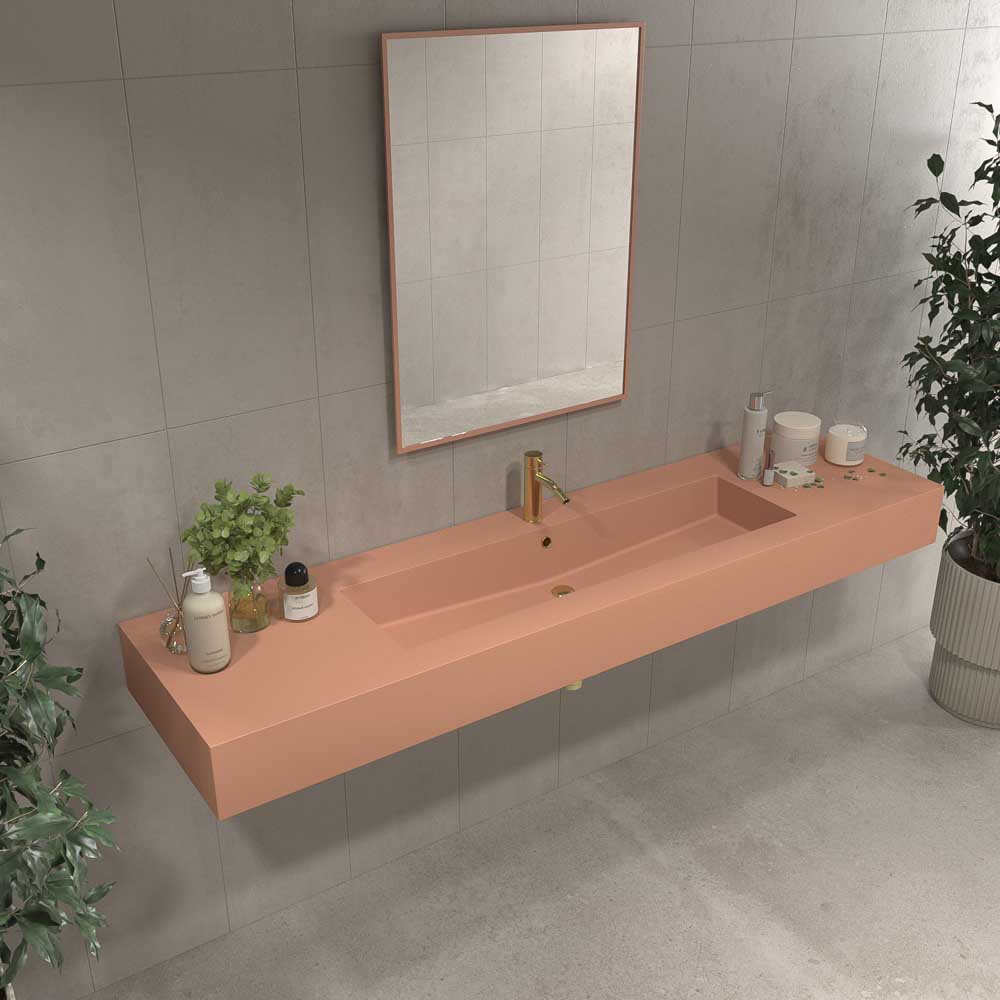 El lavabo suspendido FIONA  de seno centrado  es un firme candidato a transformar espacios de baño. De anodino a contemporáneo y, además, regalando practicidad.Los lavabos suspendidos son muy prácticos. Hacen su función sin recargar la estancia ni ocupar la parte inferior. Podrás colocar un estante inferior opcional  para la colocación de un cesto o toallas si lo deseas. O bien, dejarlo libre para limpiar el suelo del baño de forma cómoda.Puedes añadirle, no obstante, los siguientes elementos: válvula click y sifón.Otro aspecto genial de este lavabo suspendido es que se fabrica con varias dimensiones: de 120 a 200 cm de ancho y  46 cm de profundidad.Se puede fabricar en fondo 50 cm . Consultar.Las medidas del seno de este lavabo  son: 100  cm de ancho x 38 cm de fondo x  12 cm de profundidad. La garantía del producto es de 10 años y se entrega en un máximo de dos semanas.En cuanto al material, el solid surface es muy demandado por su dureza y resistencia, así como facilidades en cuanto a limpieza y mantenimiento. Aquí tienes otras de sus ventajas: