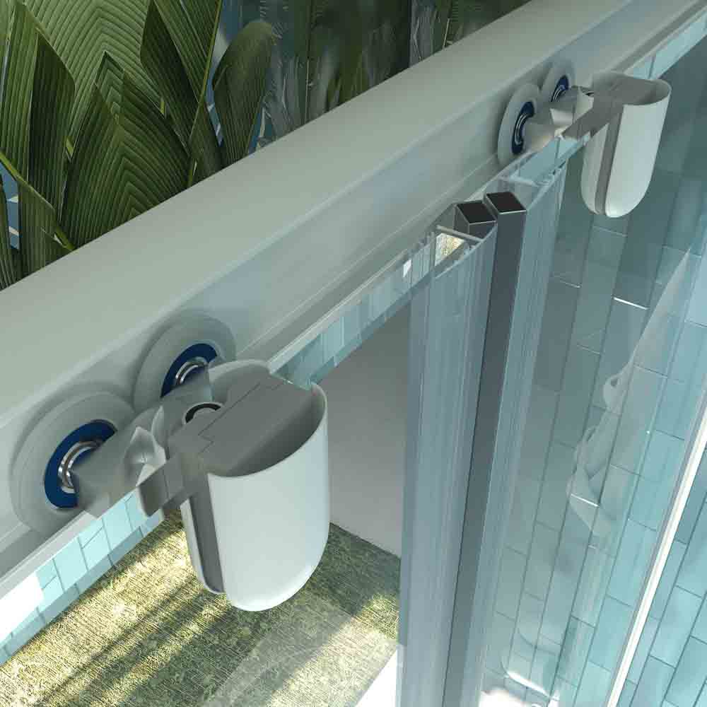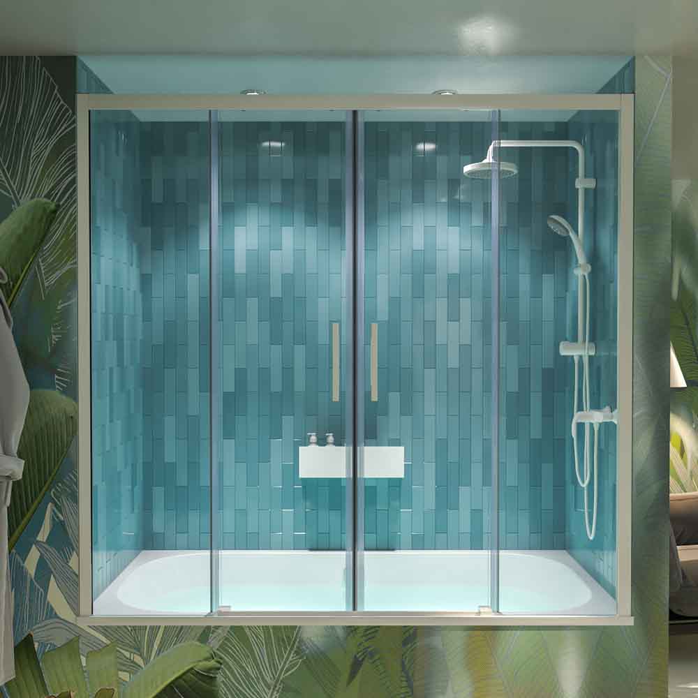 Composición y diseñoFrontal de bañera de dos fijas y dos correderas.Perfilería de aluminio Blanco mate resistente a la humedad.Mampara sin perfil inferior pero con junta de aluminio blanco mate para asegurar la estanqueidad.Cristal templado de seguridad de 6 mm. transparenteAccesorios y complementosDiseño exclusivo de asa tirador dobleRodamientos tipo tándem compensables en altura 5 mm en la parte superior.Cierre magnético de goma imán traslúcida sobre el lateral.Compensación para cualquier falsa escuadra de la pared de 1,5 cm a cada lado.Sistema antivuelco para mayor seguridad.Elementos técnicosAltura estándar de 150 cm (se puede reducir/aumentar bajo presupuesto, consúltanos).Abarca medidas de ancho hasta 205 cm (decide la medida de cada hoja).Montaje e instalaciónIncluye manual de instrucciones detallado y toda la tornillería necesaria.Fácil de instalar, pero nos puedes solicitar este servicio desde cualquier punto de la Península y Baleares.Entrega y garantía3 años de garantía de todos los elementos y piezas de la mampara.Garantía de repuestos a largo plazo.Sin gastos de envío. El producto está asegurado en su transporte hasta las 24 horas posteriores a su entrega.Plazo de fabricación de 7-10 dias al ser un producto que se fabrica a medida.LimpiezaTratamiento anticalMampara sencilla de limpiar. No conviene aplicar productos químicos abrasivos o que contengan cloro
