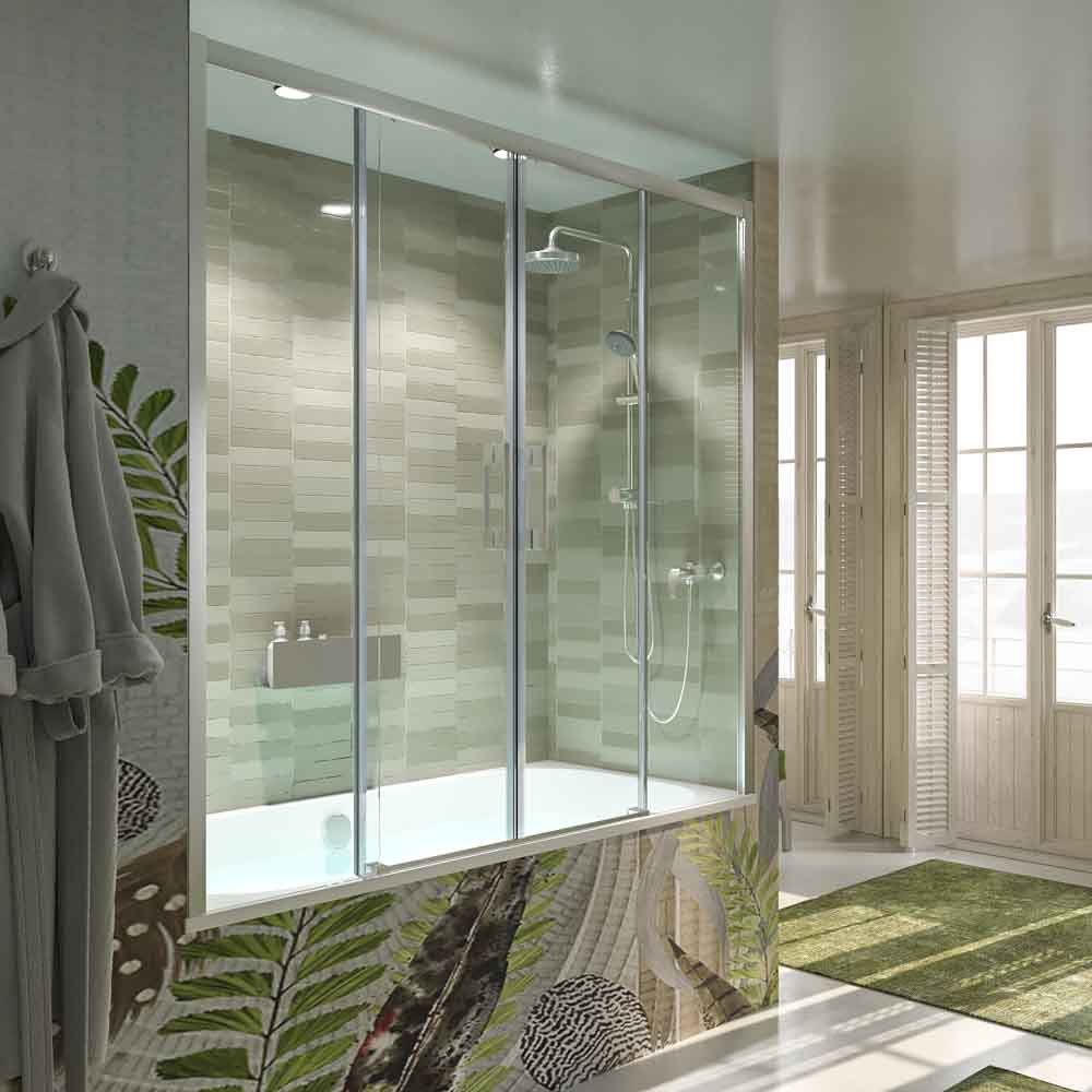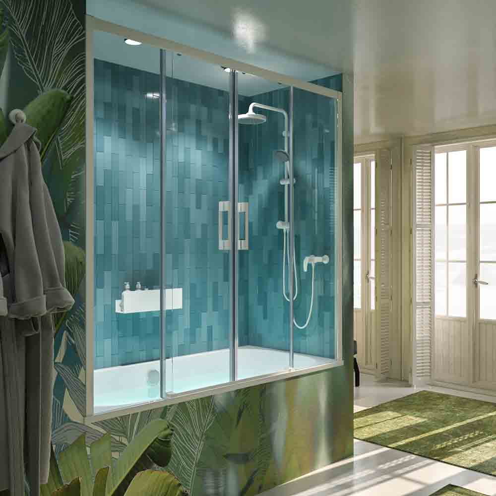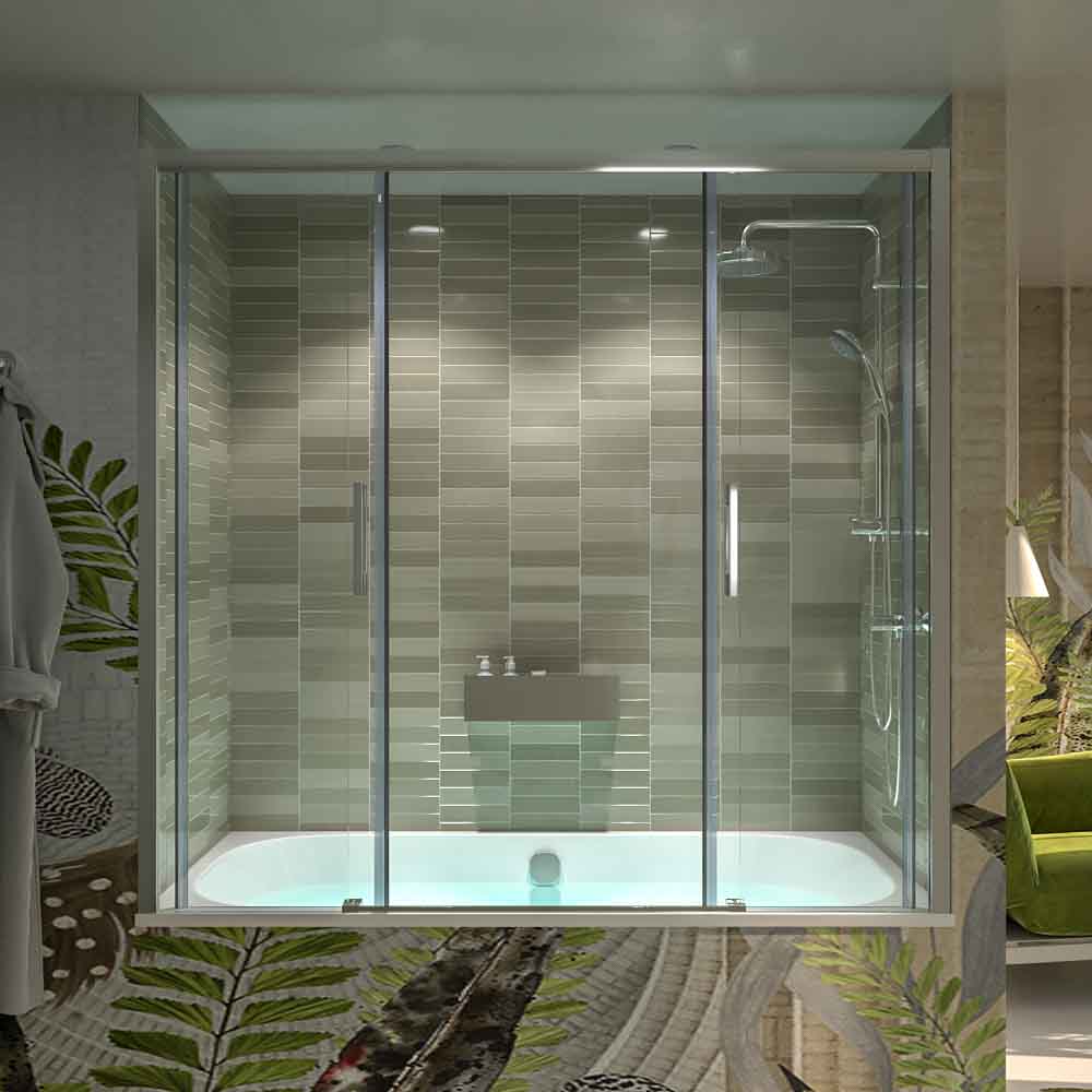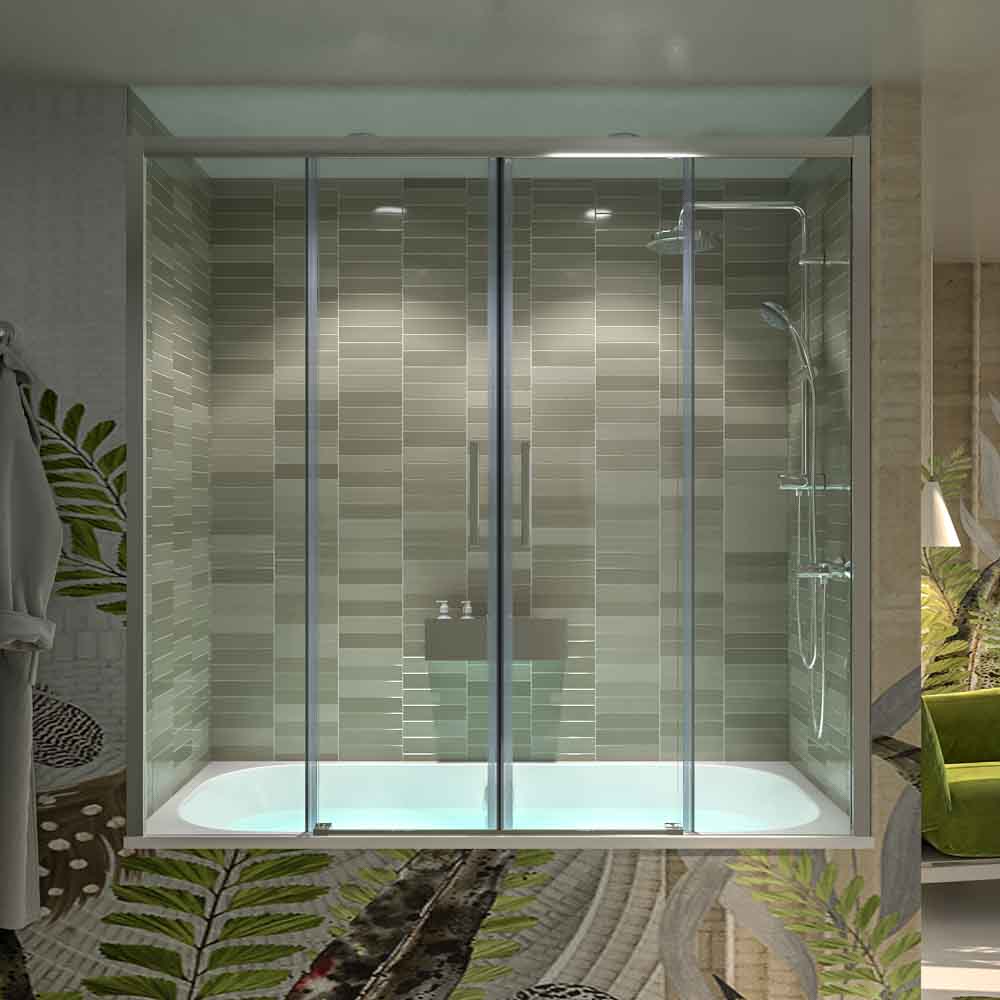 Composición y diseñoFrontal de bañera de dos fijas y dos correderas.Perfilería de aluminio Cromo brillo resistente a la humedad.Mampara sin perfil inferior pero con junta de aluminio cromo brillo para asegurar la estanqueidad.Cristal templado de seguridad de 6 mm. transparenteAccesorios y complementosDiseño exclusivo de asa tirador dobleRodamientos tipo tándem compensables en altura 5 mm en la parte superior.Cierre magnético de goma imán traslúcida sobre el lateral.Compensación para cualquier falsa escuadra de la pared de 1,5 cm a cada lado.Sistema antivuelco para mayor seguridad.Elementos técnicosAltura estándar de 150 cm (se puede reducir/aumentar bajo presupuesto, consúltanos).Abarca medidas de ancho hasta 180 cm (decide la medida de cada hoja).Montaje e instalaciónIncluye manual de instrucciones detallado y toda la tornillería necesaria.Fácil de instalar, pero nos puedes solicitar este servicio desde cualquier punto de la Península y Baleares.Entrega y garantía3 años de garantía de todos los elementos y piezas de la mampara.Garantía de repuestos a largo plazo.Sin gastos de envío. El producto está asegurado en su transporte hasta las 24 horas posteriores a su entrega.Plazo de fabricación de 7-10 dias al ser un producto que se fabrica a medida.LimpiezaTratamiento anticalMampara sencilla de limpiar. No conviene aplicar productos químicos abrasivos o que contengan cloro