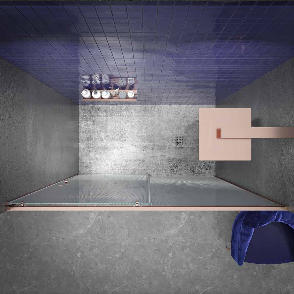 • Mampara de ducha frontal 1 fijo – 1 puerta corredera sin perfil inferior, perfil termo lacado oro rosa mate, cristal templado 6 mm de seguridad , altura 195 cm.