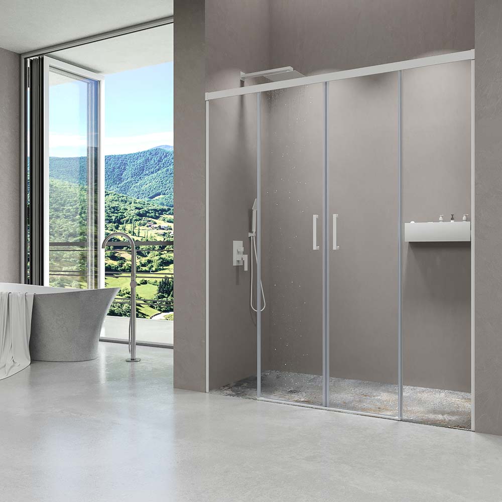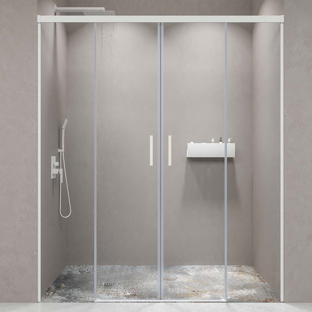 • Mampara de ducha frontal 2 fijos – 2 puertas correderas sin perfil inferior, perfil anodizado blanco mate, cristal templado 6 mm de seguridad, altura 195 cm.