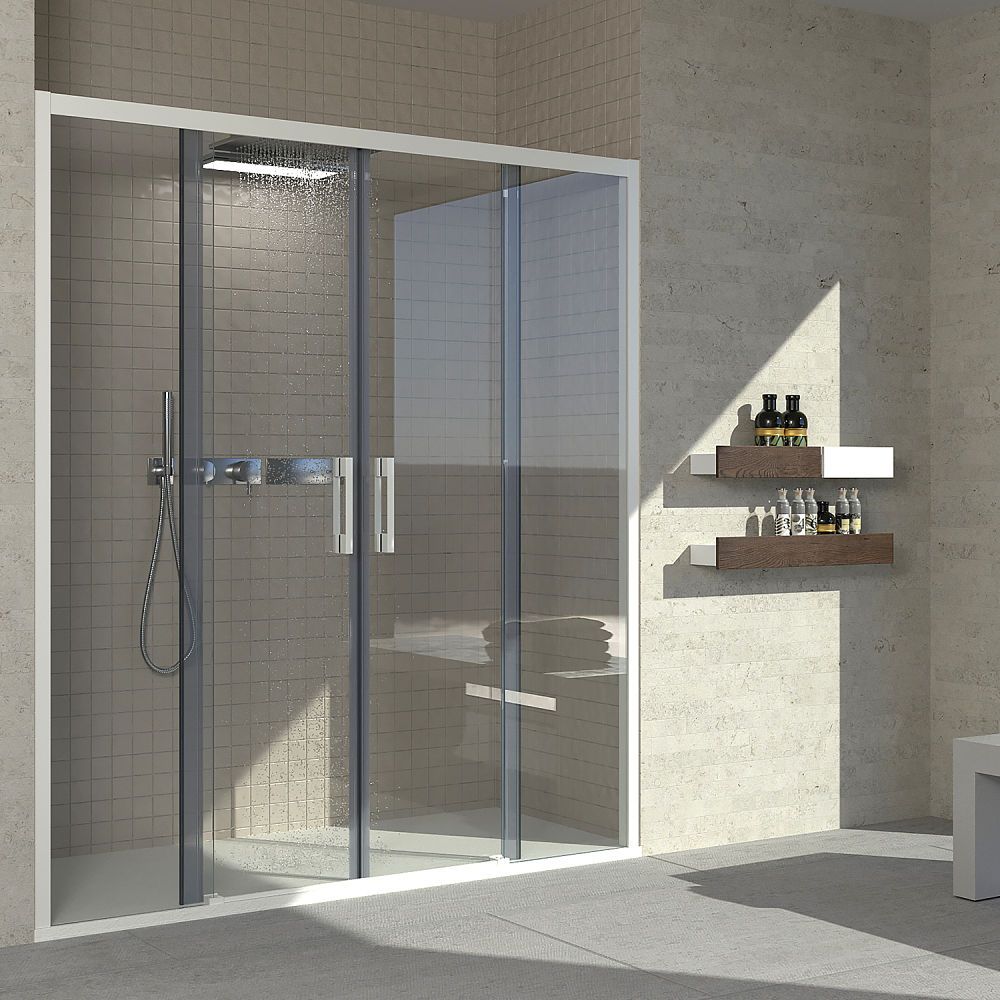 • Mampara de ducha frontal 2 fijos – 2 puertas correderas sin perfil inferior blanco mate, cristal templado 6 mm de seguridad , altura 195 cm.