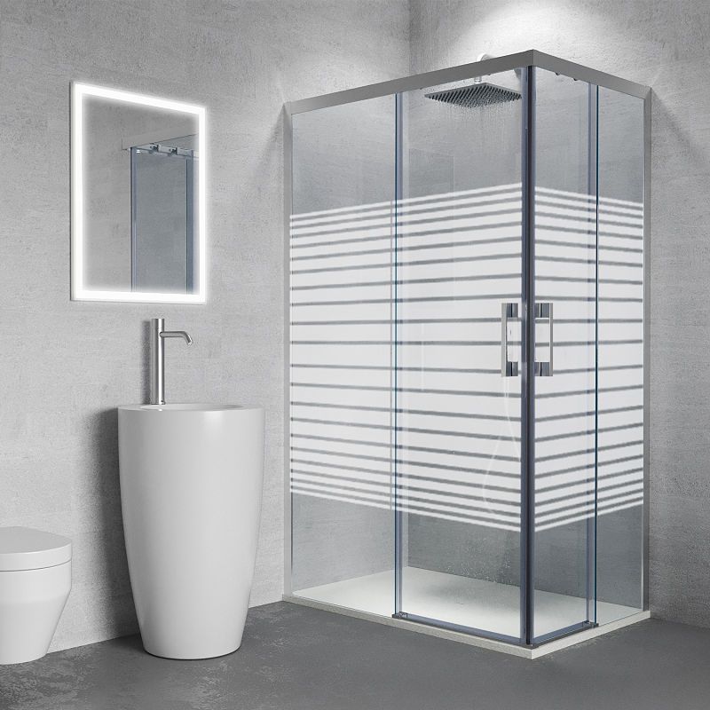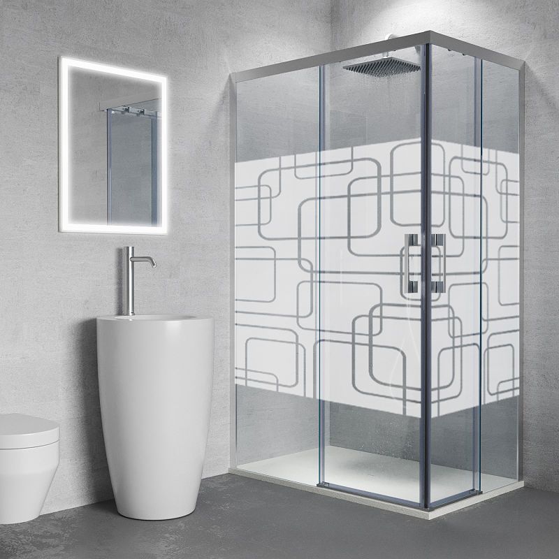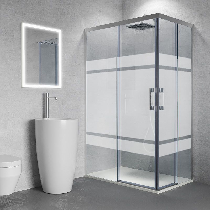 Mampara de ducha rectangular FLARE apertura angular 2 fijos-2 puertas correderas SERIGRAFIADAS . Sin perfil inferior. Con tratamiento anti-cal. Acabado CROMO BRILLO