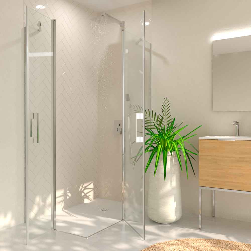- Angular de ducha dos hojas fijas y dos abatibles. Acceso por el vértice del plato.