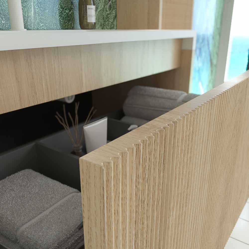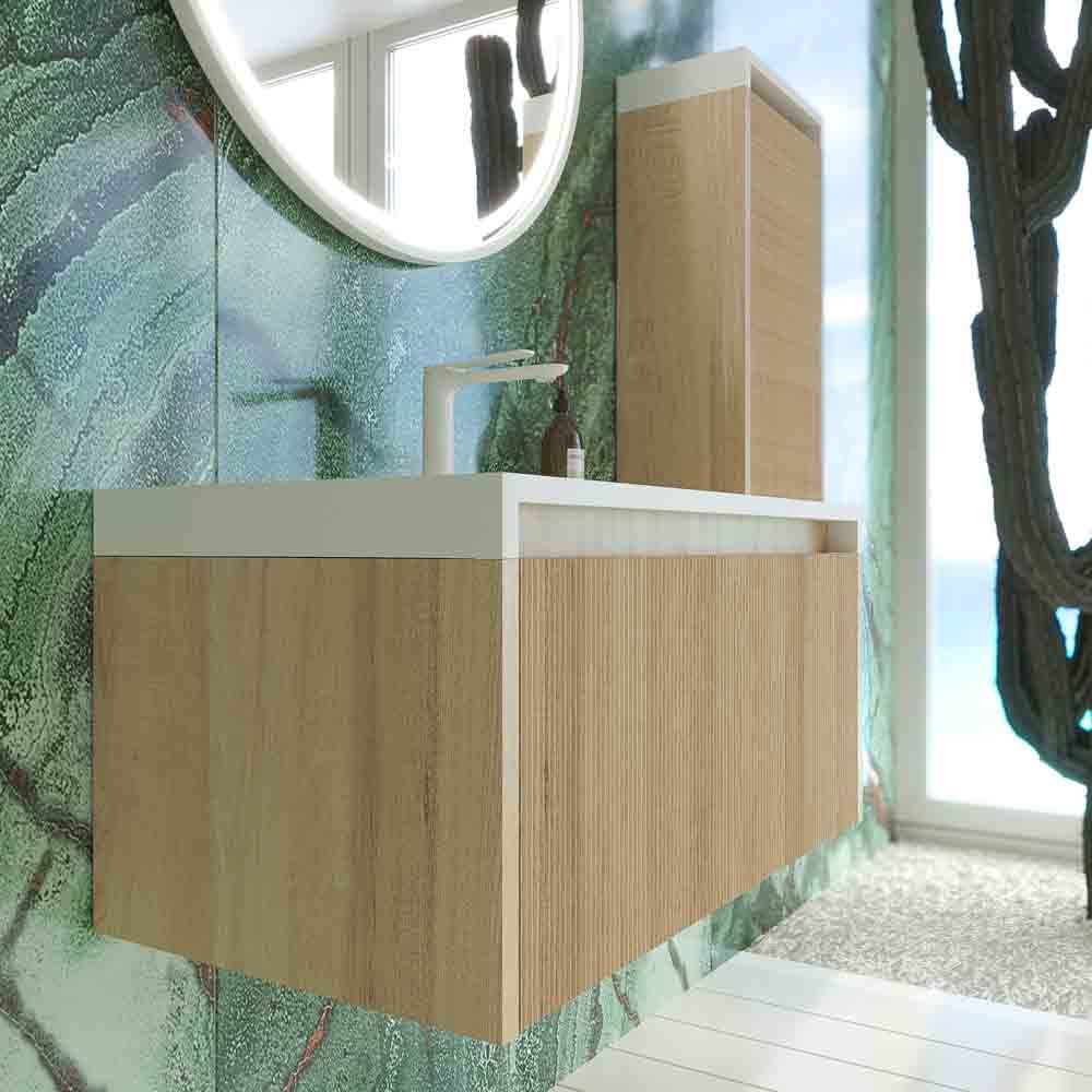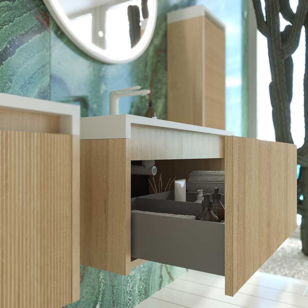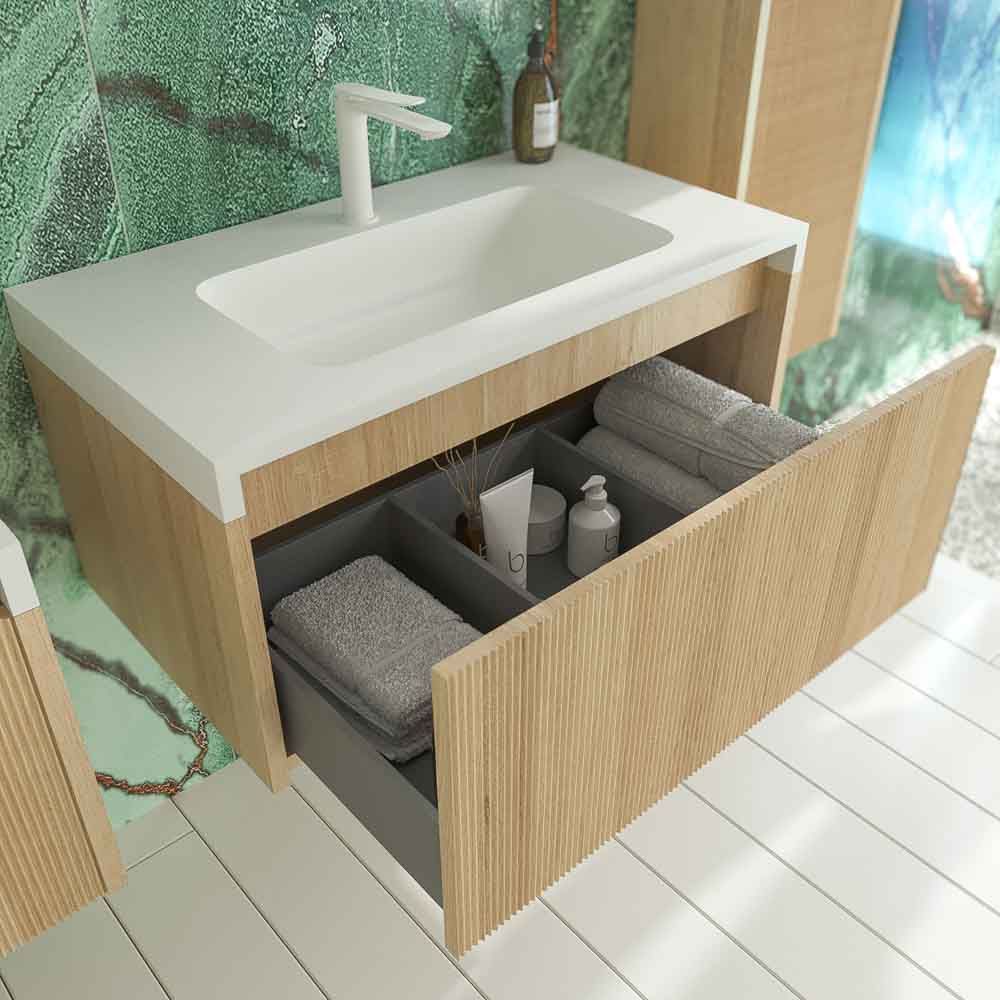 Los muebles de baño suspendido con cajón con separadores son ideales para almacenar todos los enseres de baño en orden. Las medida del mueble son de 60 cm / 80 cm de ancho x 45 cm de fondo x 40 cm de alto.Esta fabricado en roble natural , un material muy resistente y duradero para que el mueble tenga una larga vida. La pintura que se proyecta en el módulo esa base de iones de plata antibacteriana que lo hace mas resistente. El frente madera maciza roble fránces lo hace un mueble de baño de diseño único en el mercado nacional e internacional.Está compuesto por 1 cajón fabricado con guías metálicas de extracción total con cierre amortiguado. La apertura y cierre de los cajones se realiza con sistema de uñero .Para completar el mueble de baño de diseño, el lavabo de SOLID SURFACE se puede acabar en la mismo color del mueble y puedes añadir espejos enmarcados en aluminio exactamente igual al color del mueble. Combina con todos los tipos de espejos de nuestro catalogo.El mueble lo podrás escoger en varios acabados diferentes. Una amplia gama en colores para que no tengas problemas de compatibilidad con el resto de accesorios de baño.Para que no pierdas tiempo en montarlo, el mueble te llegará a casa completamente ensamblado. Solamente tendrás que recibirlo e instalarlo a pared de manera sencilla.Un mueble con diseño internacional para tu cuarto de baño.