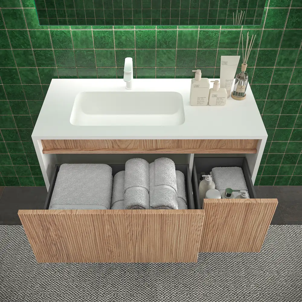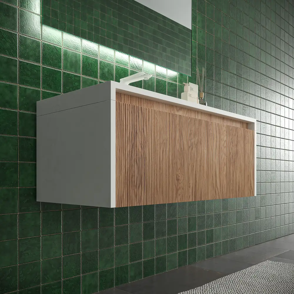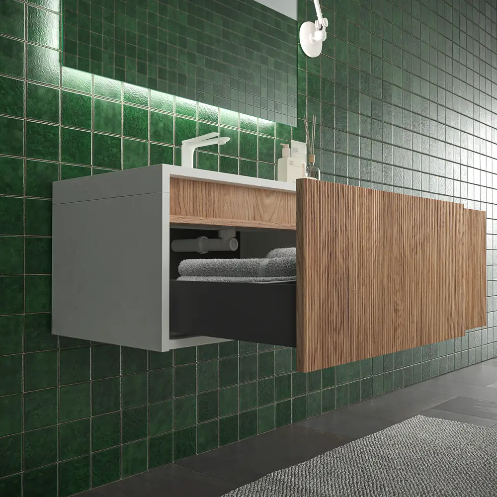 Los muebles de baño suspendido con cajones con separadores son ideales para almacenar todos los enseres de baño en orden. Las medida del mueble son de 90 cm / 110 cm de ancho x 45 cm de fondo x 40 cm de alto. Esta fabricado en MDF polilaminado, un material muy resistente y duradero para que el mueble tenga una larga vida.. El frente alistonado lo hace un mueble de baño de diseño único en el mercado nacional e internacional. Está compuesto por 3 cajones fabricado con guías metálicas de extracción total con cierre amortiguado. La apertura y cierre de los cajones se realiza con sistema de uñero .Para completar el mueble de baño de diseño, el lavabo de SOLID SURFACE se puede acabar en la mismo color del mueble y puedes añadir espejos enmarcados en aluminio exactamente igual al color del mueble. Combina con todos los tipos de espejos de nuestro catalogo. El mueble lo podrás escoger en varios acabados diferentes. Una amplia gama en colores para que no tengas problemas de compatibilidad con el resto de accesorios de baño .Para que no pierdas tiempo en montarlo, el mueble te llegará a casa completamente ensamblado. Solamente tendrás que recibirlo e instalarlo a pared de manera sencilla. Un mueble con diseño internacional para tu cuarto de baño.