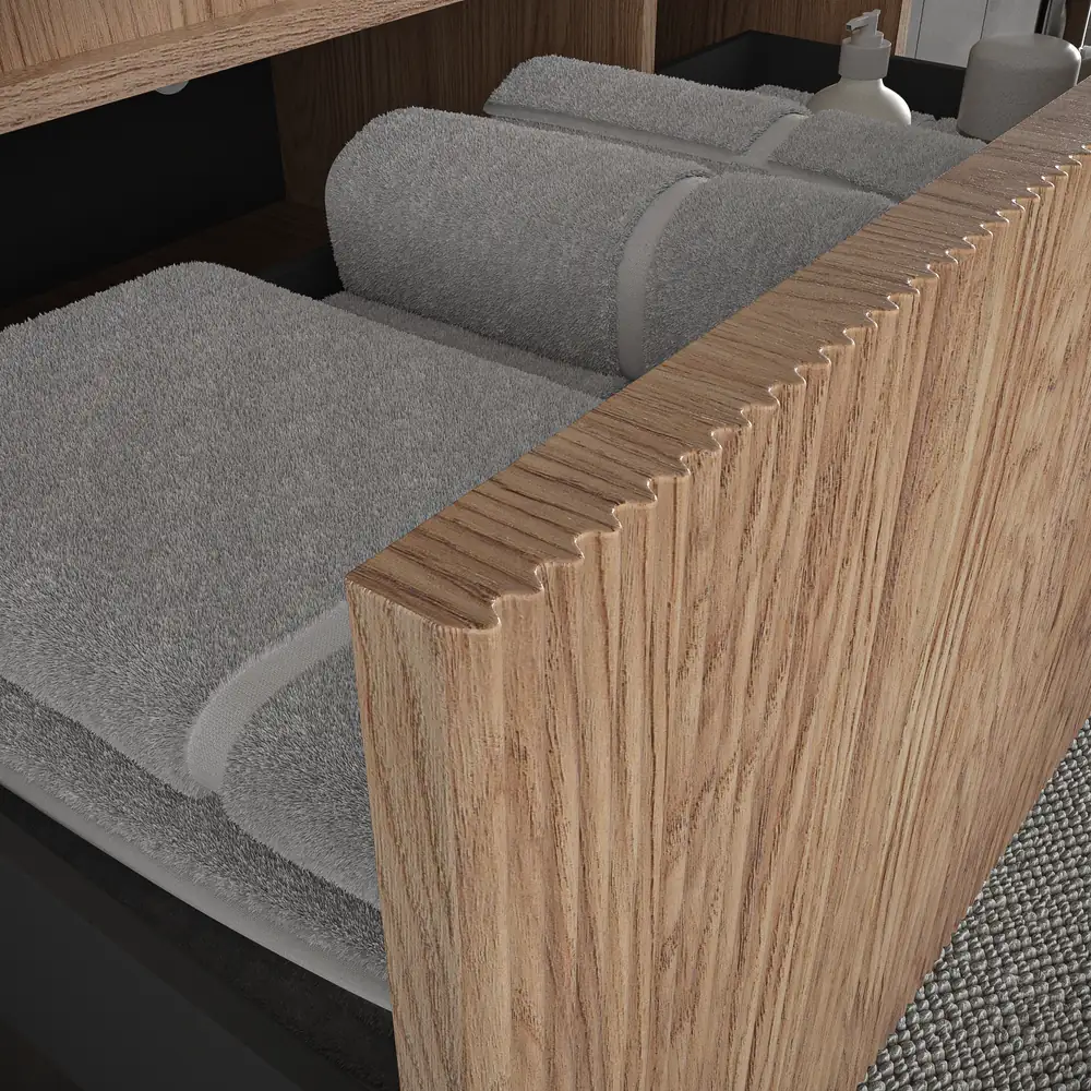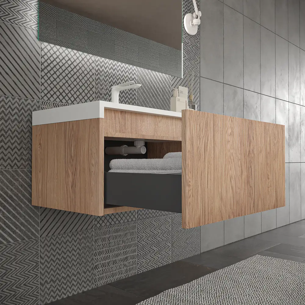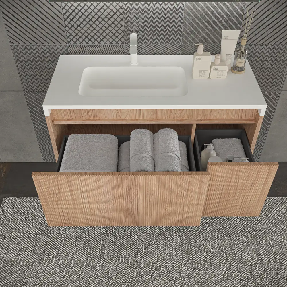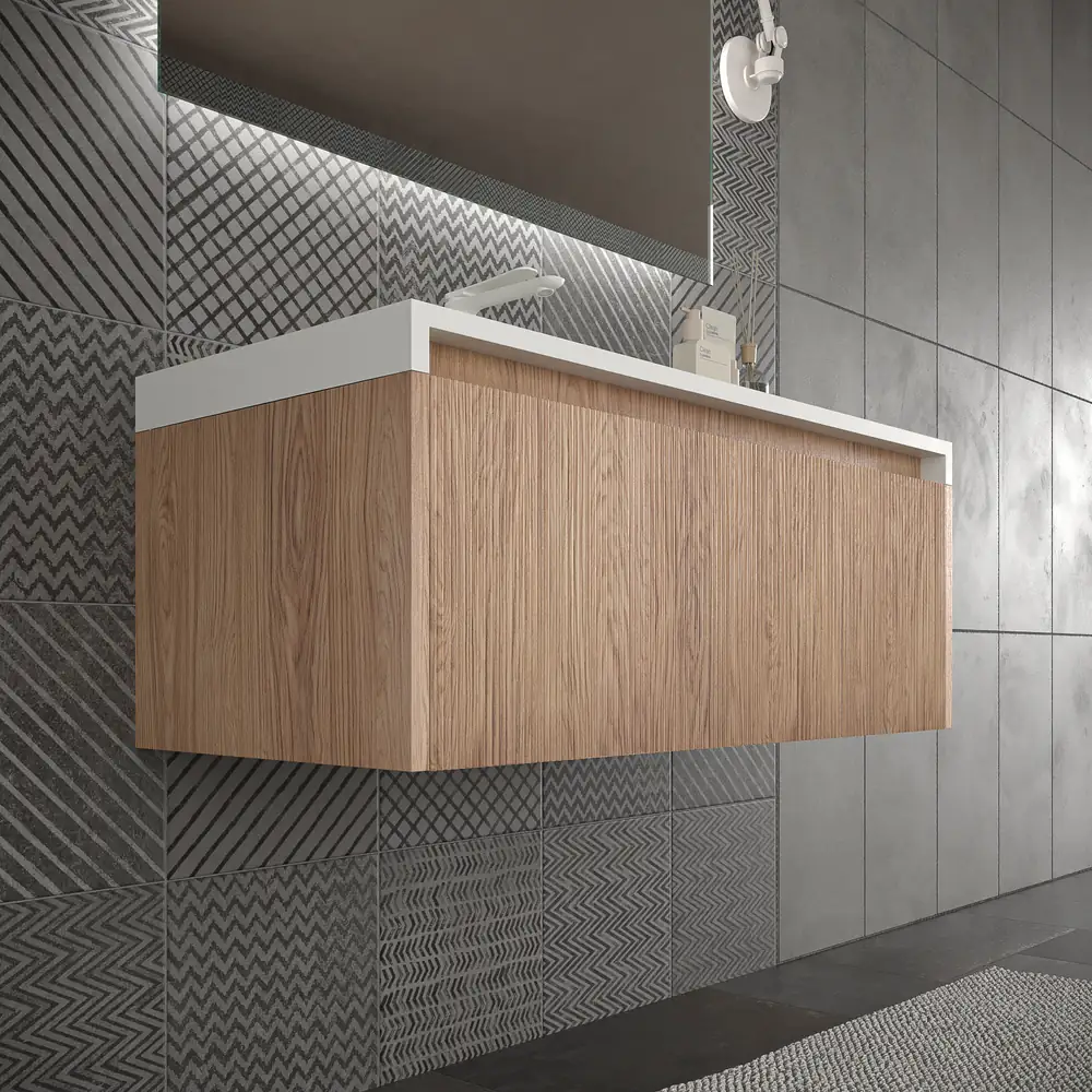Los muebles de baño suspendido con cajones con separadores son ideales para almacenar todos los enseres de baño en orden. Las medida del mueble son de 90 cm / 110 cm de ancho x 45 cm de fondo x 40 cm de alto. Esta fabricado en MDF polilaminado, un material muy resistente y duradero para que el mueble tenga una larga vida.. El frente alistonado lo hace un mueble de baño de diseño único en el mercado nacional e internacional. Está compuesto por 3 cajones fabricado con guías metálicas de extracción total con cierre amortiguado. La apertura y cierre de los cajones se realiza con sistema de uñero .Para completar el mueble de baño de diseño, el lavabo de SOLID SURFACE se puede acabar en la mismo color del mueble y puedes añadir espejos enmarcados en aluminio exactamente igual al color del mueble. Combina con todos los tipos de espejos de nuestro catalogo. El mueble lo podrás escoger en varios acabados diferentes. Una amplia gama en colores para que no tengas problemas de compatibilidad con el resto de accesorios de baño .Para que no pierdas tiempo en montarlo, el mueble te llegará a casa completamente ensamblado. Solamente tendrás que recibirlo e instalarlo a pared de manera sencilla. Un mueble con diseño internacional para tu cuarto de baño.