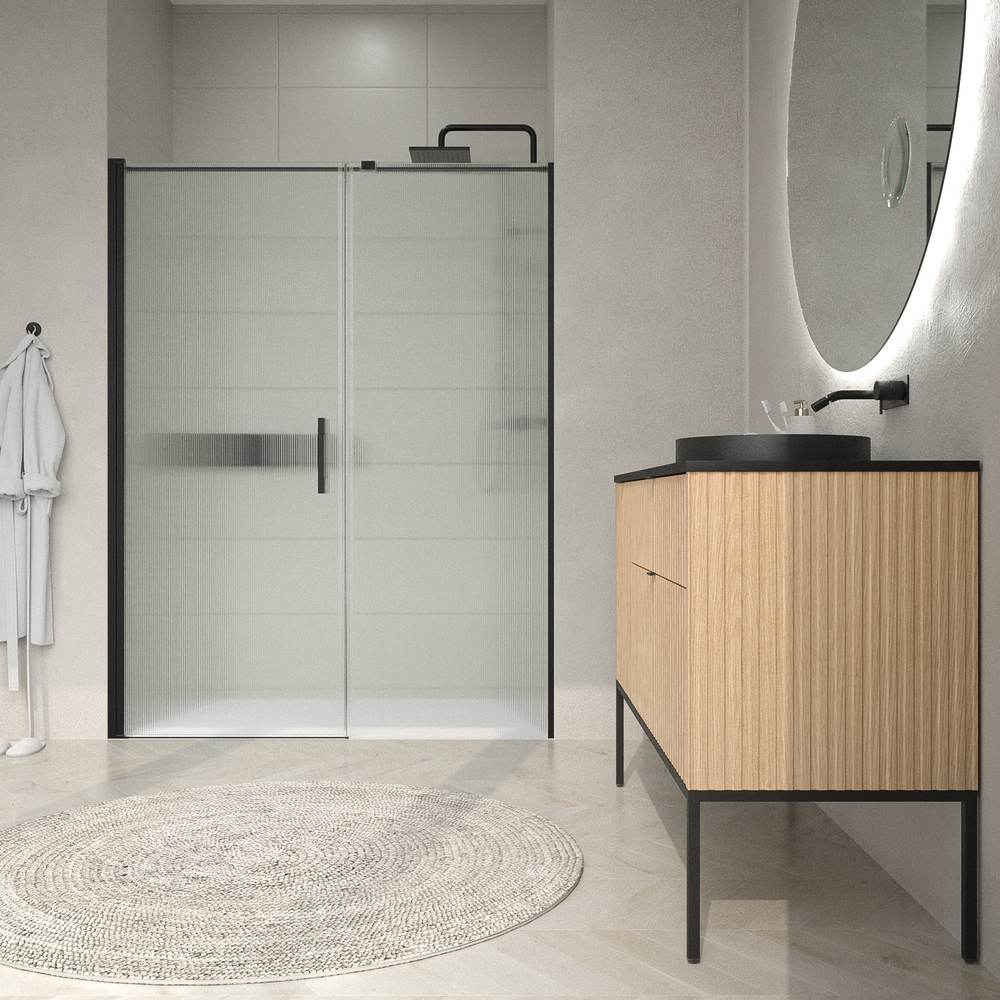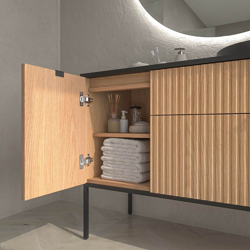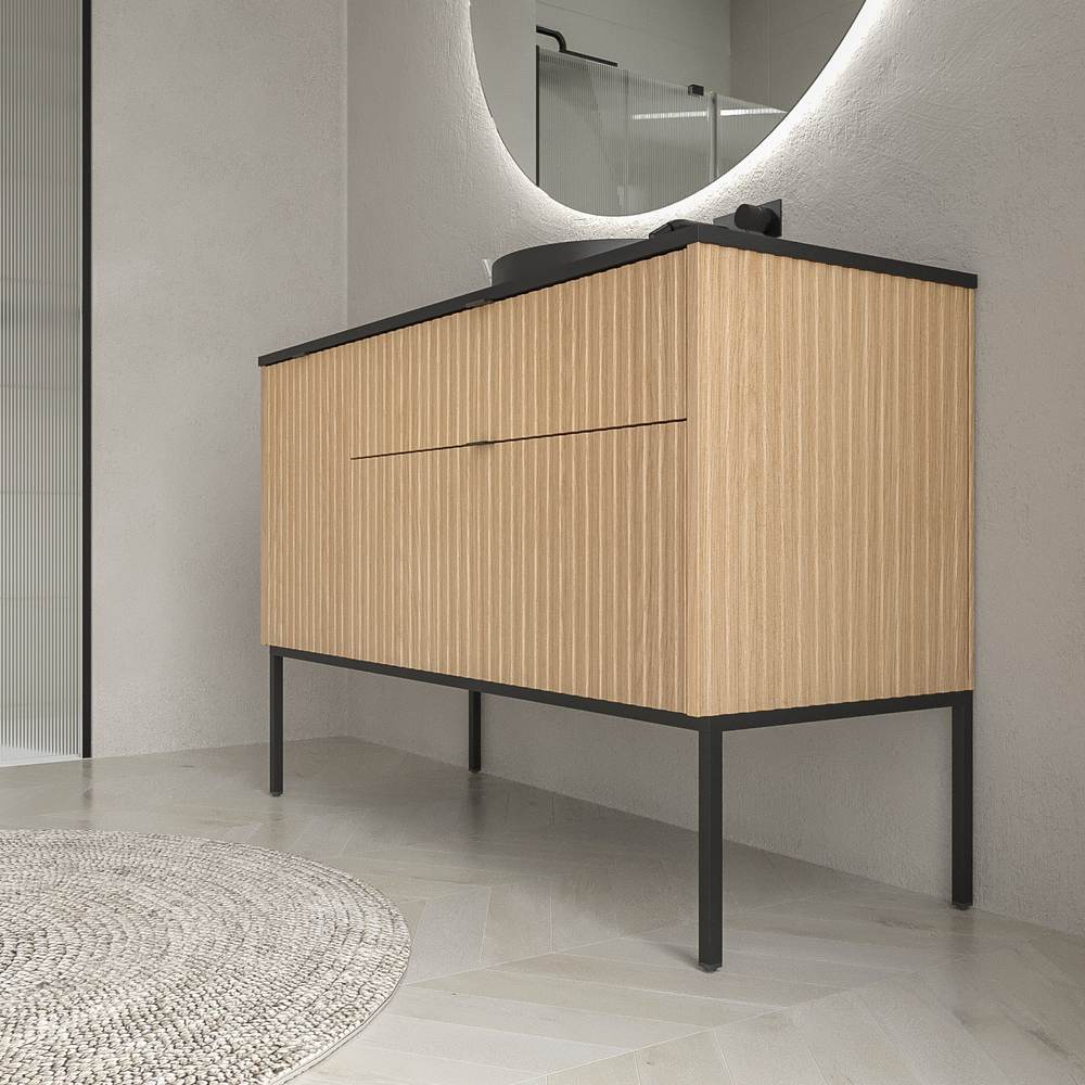 Mueble de baño FLEX con patas 2 cajones/1puerta acabado ROBLE CLARO con lavabo semiencastrado Solid Surface NEGRO