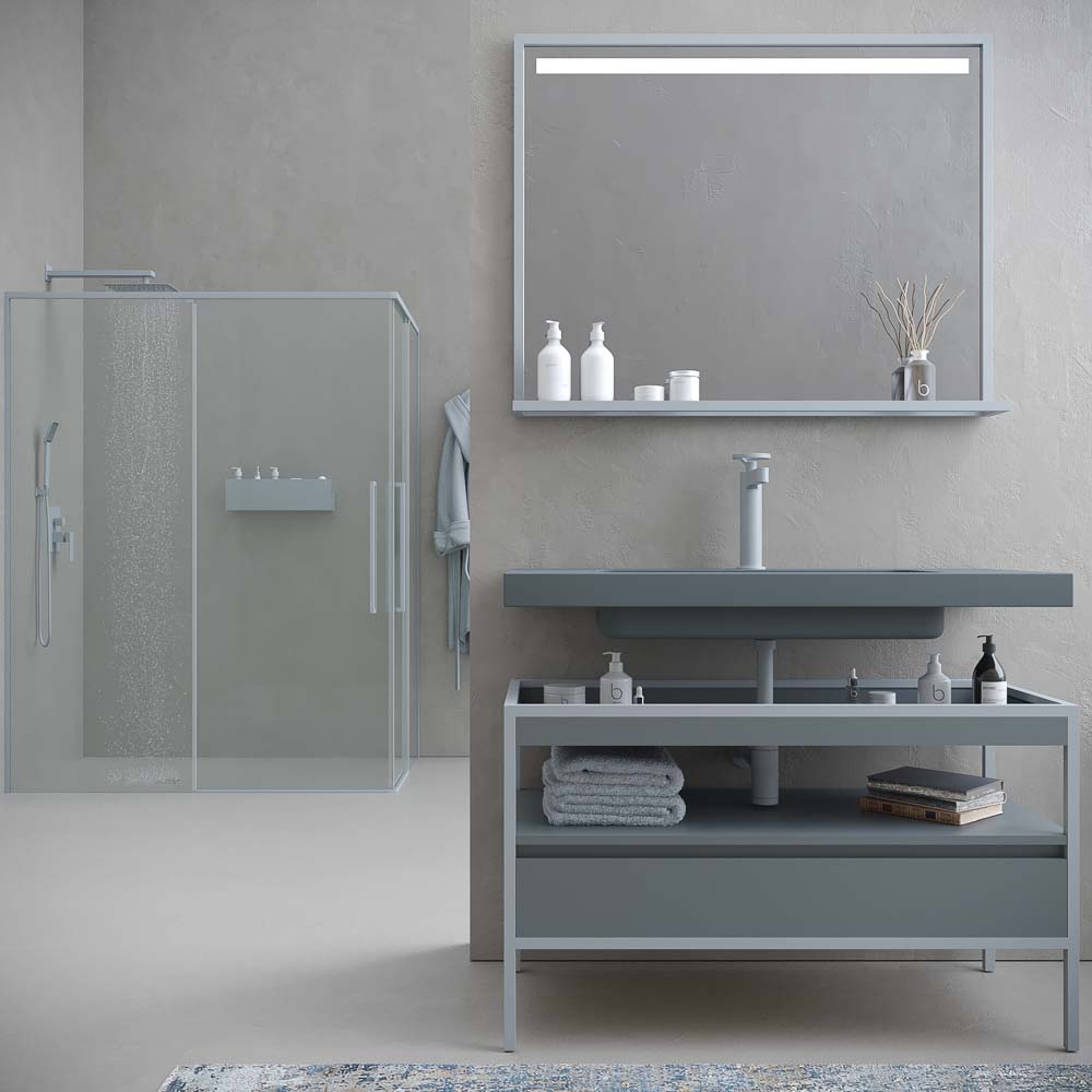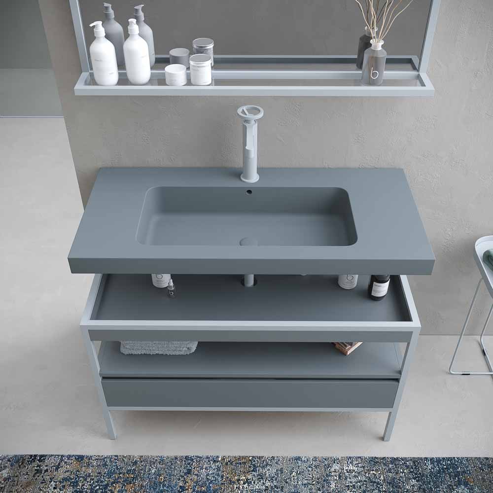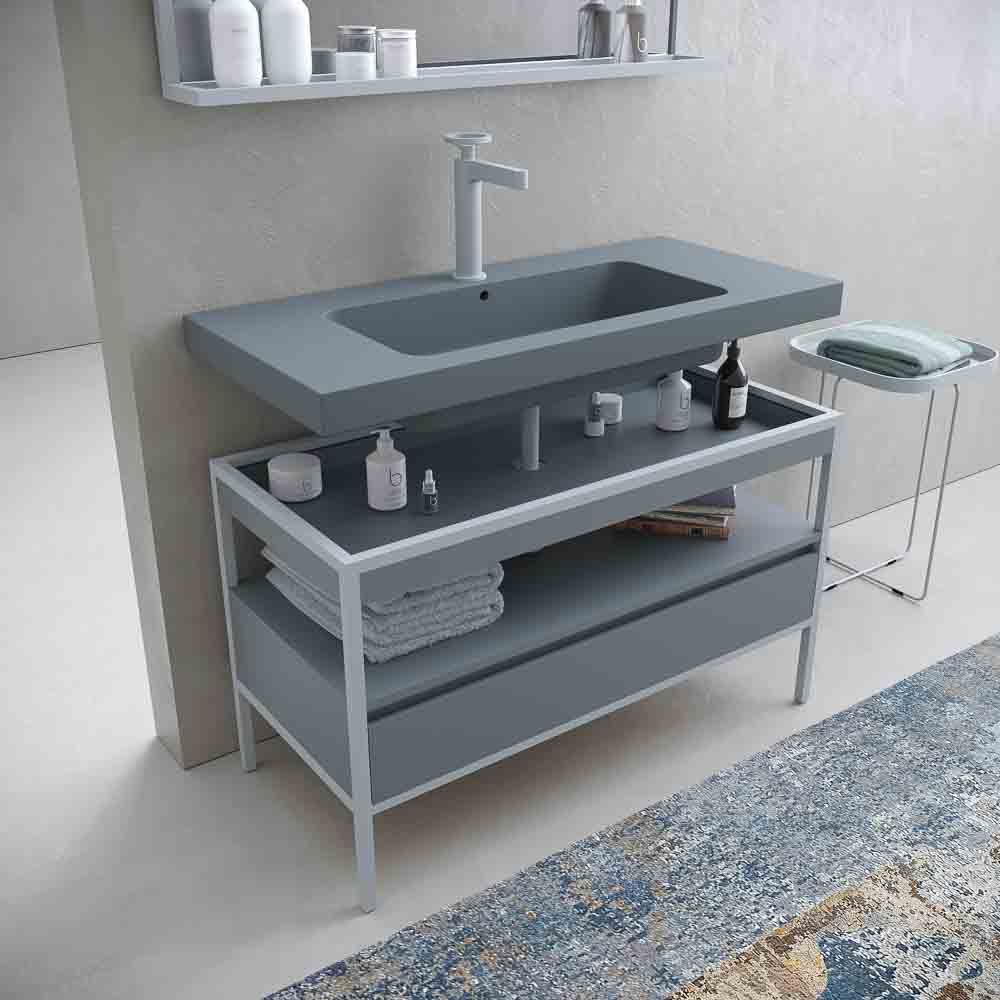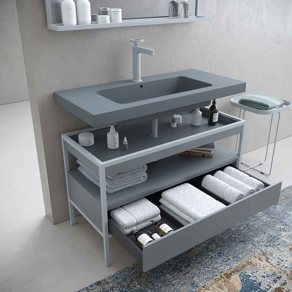 Conjunto de baño moderno Estructura aluminio con lavabo colores a elegir . Con patas y con 1 cajón. Se puede añadir un espejo a juego, y otras opciones.Indicar en «Notas del pedido » acabado del mueble, estructura y lavabo.