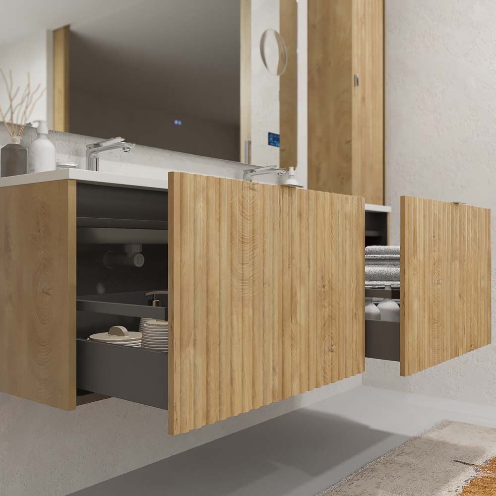 Los muebles de baño suspendido con cajónes son ideales para almacenar todos los enseres de baño en orden. Las medida del mueble son de 120 cm / 140 cm /150 cm / 180 cm de ancho x 45 cm de fondo x 50 cm de alto.Esta fabricado en MDF alta presión , un material muy resistente y duradero para que el mueble tenga una larga vida. El frente polilaminado con palilleria lo hace un mueble de baño de diseño único en el mercado nacional e internacional.Está compuesto por 2 cajones fabricados con guías metálicas de extracción total con cierre amortiguado. La apertura y cierre de los cajones se realiza con tirador.Para completar el mueble de baño de diseño, el lavabo de SOLID SURFACE se puede acabar en la mismo color del mueble y puedes añadir espejos enmarcados en aluminio exactamente igual al color del mueble. Combina con todos los tipos de espejos de nuestro catalogo.El mueble lo podrás escoger en varios acabados diferentes ( OLMO , ROBLE CENIZA, ROBLE TEXAS ). Una amplia gama en colores para que no tengas problemas de compatibilidad con el resto de accesorios de baño.Para que no pierdas tiempo en montarlo, el mueble te llegará a casa completamente ensamblado. Solamente tendrás que recibirlo e instalarlo a pared de manera sencilla.Un mueble con diseño internacional para tu cuarto de baño.
