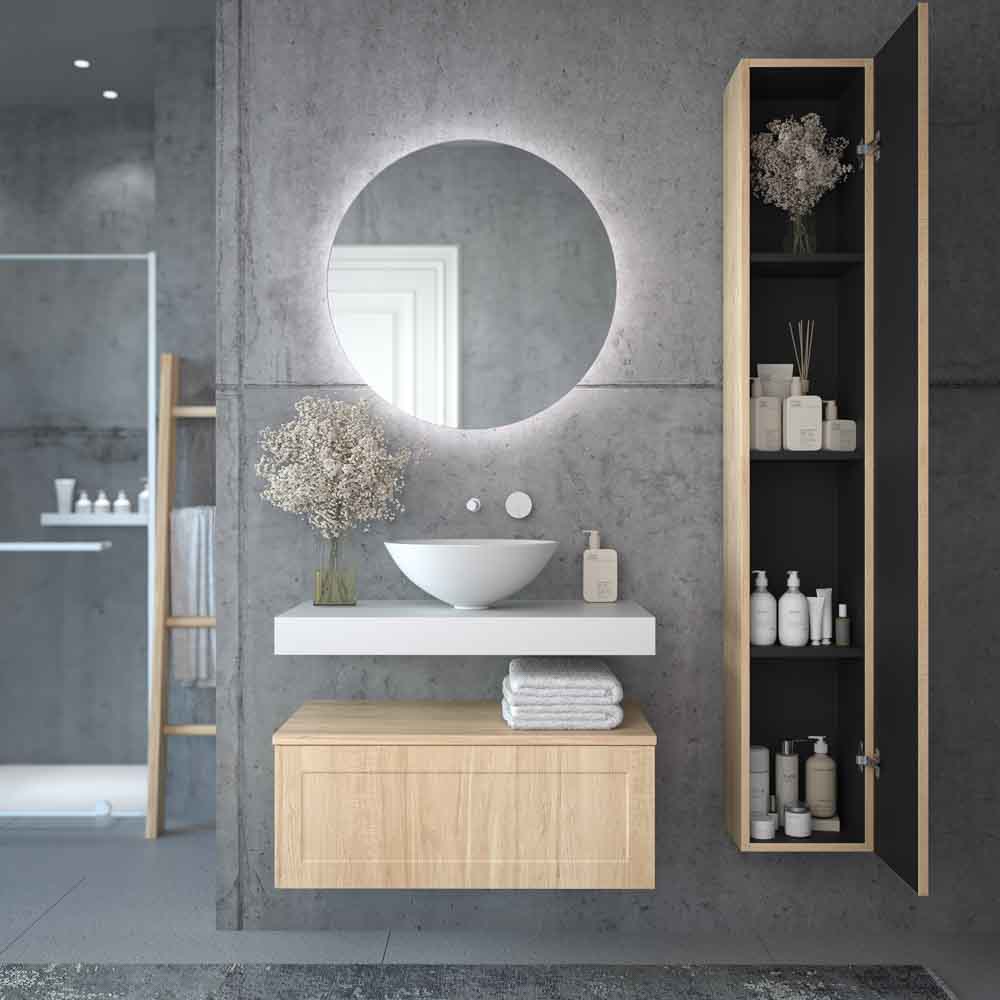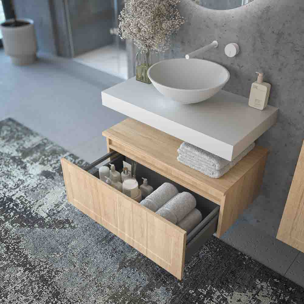 Disponible en 60, 80 ,90 y 100 cm de ancho, con una profundidad de 45 cm y una altura de 35 cm, el conjunto incluye una tapa y lavabo de Solid Surface acabado mate, que añade un toque de sofisticación a tu espacio. El cajón es de gran capacidad está equipado con guías de cierre amortiguado y extracción total, asegurando un deslizamiento suave y silencioso.