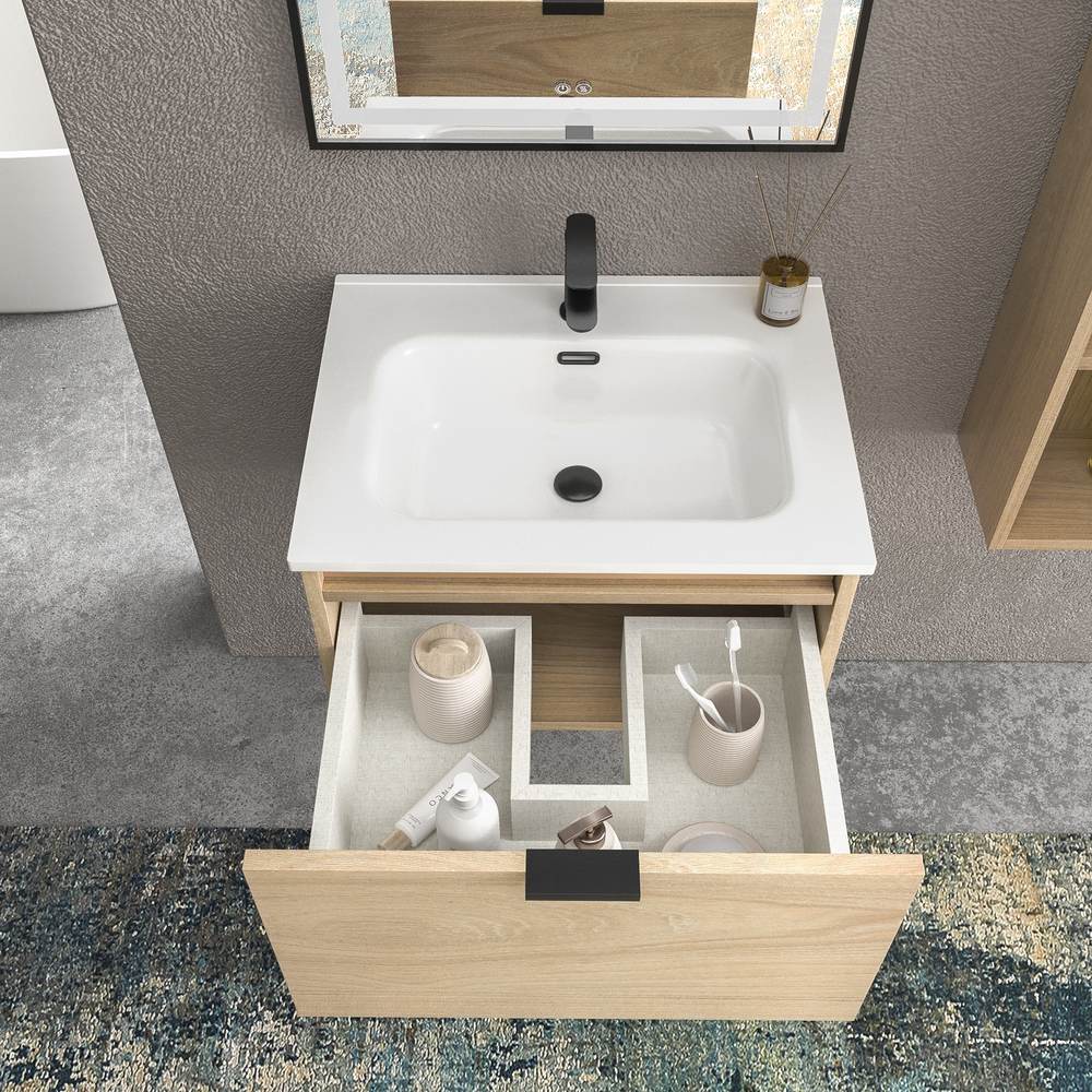 Composición: Este mueble incorpora lavabo de cerámica y si lo desea, un espejo liso de la serie luna de la misma medida de ancho que el mueble y altura de 80cm. No tendrás problemas en la elección del lavabo ya que lo incluimos compatible con el módulo. Este mueble de baño está compuesto por 1 cajón y con guías ocultas de de alta calidad, de cierre progresivo e interior textil para hacer más cómoda la apertura y cierre.