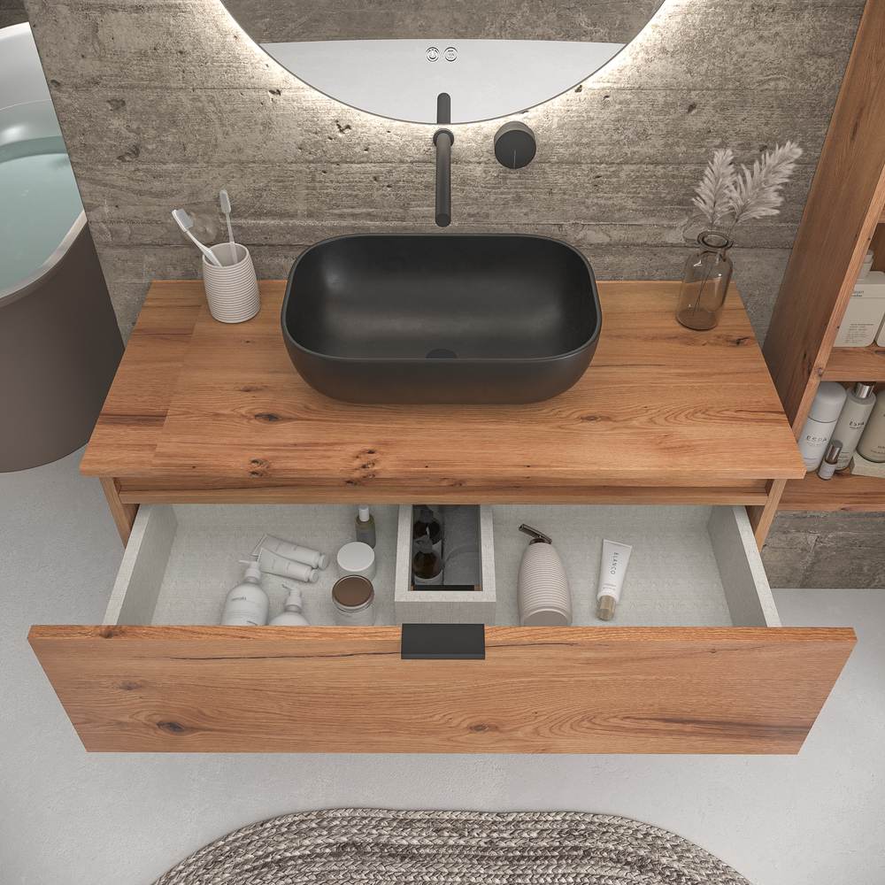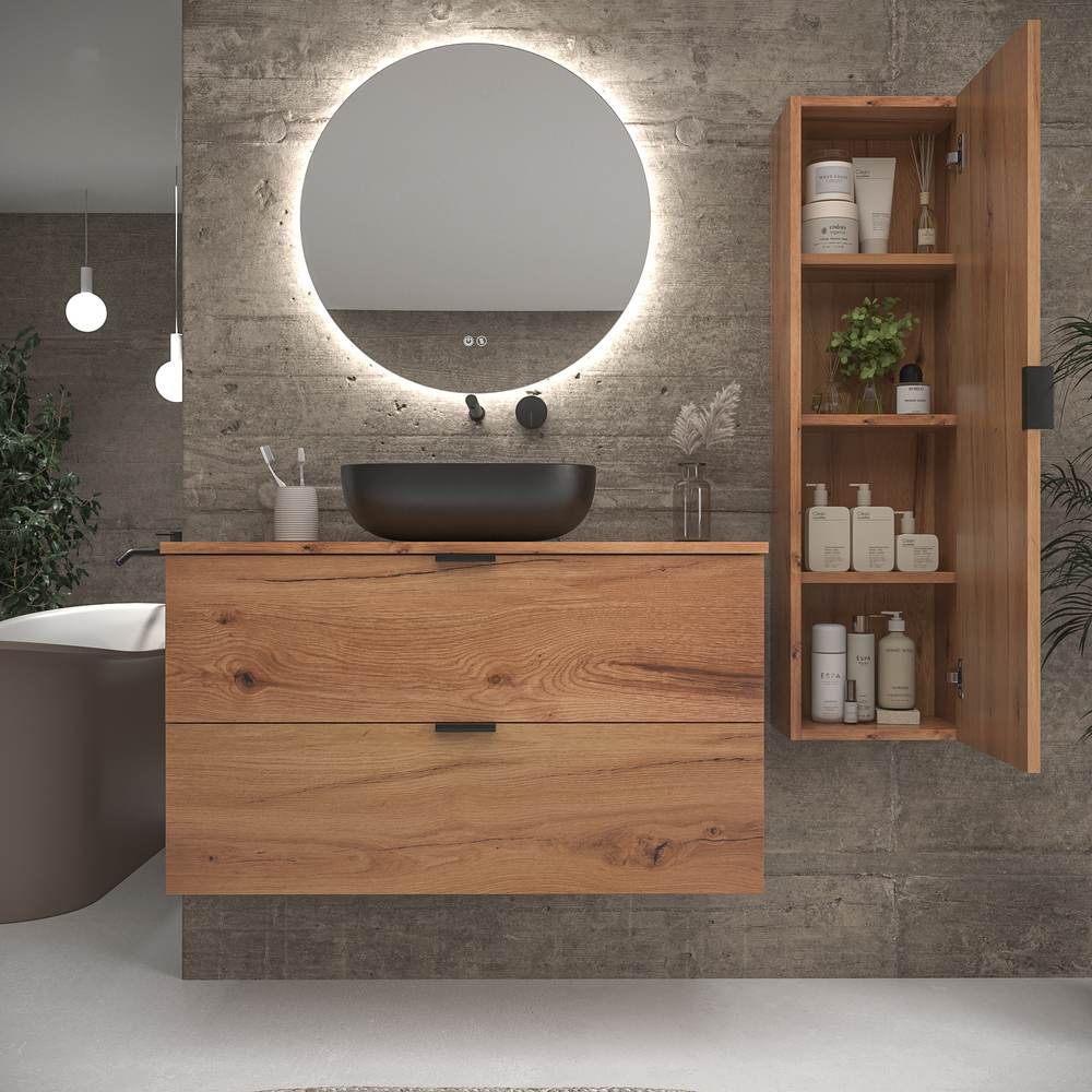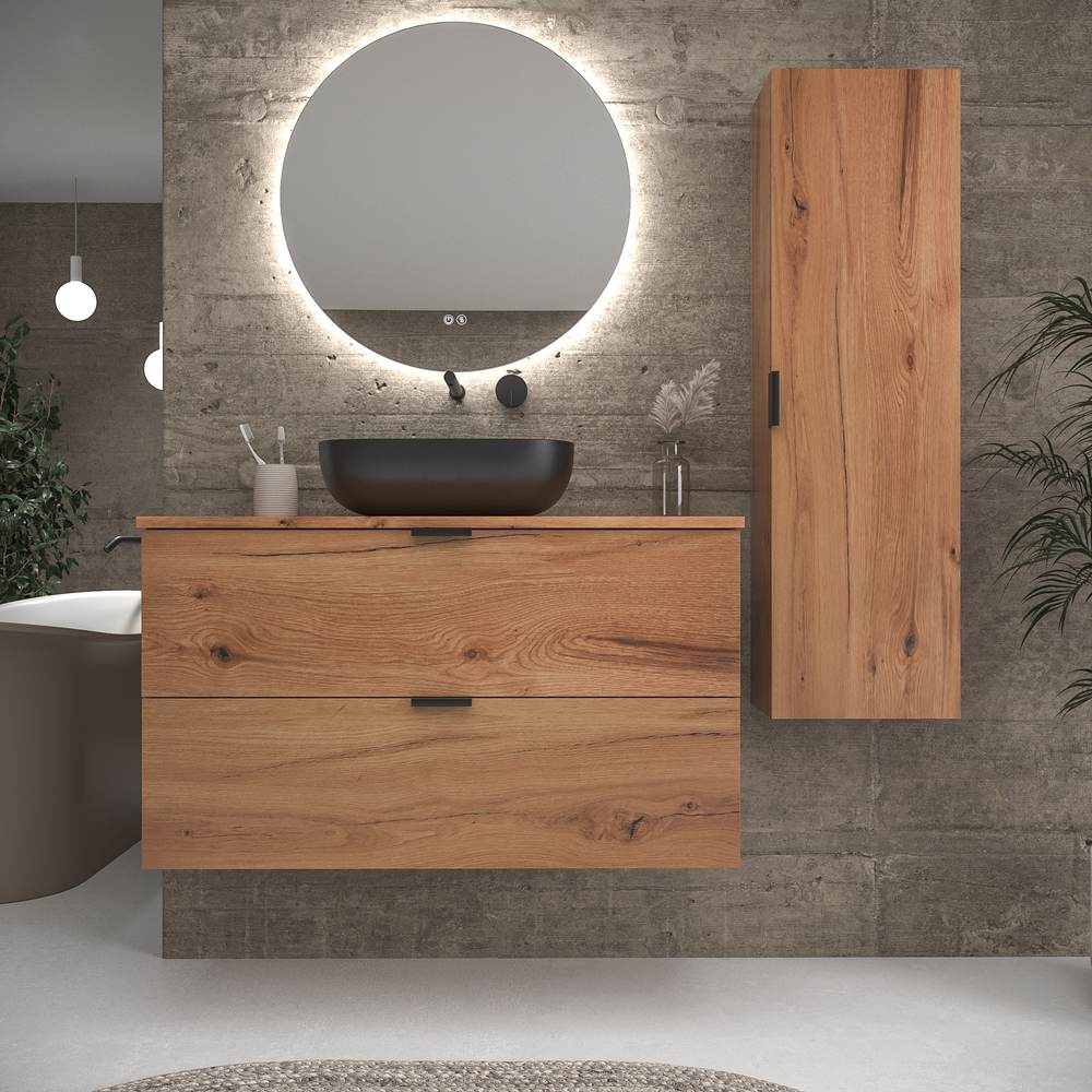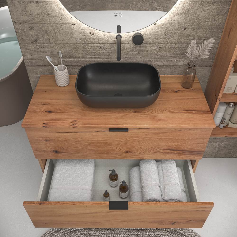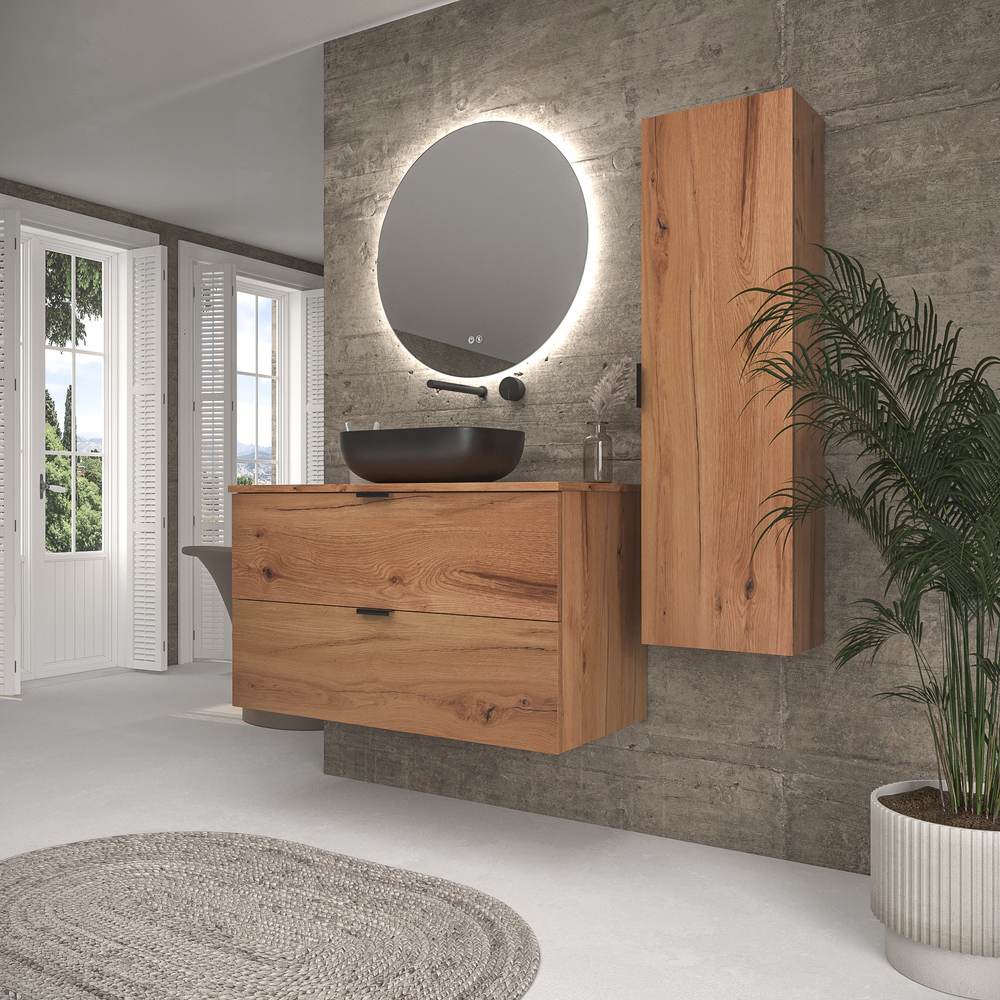 Composición: Este mueble incorpora lavabo de cerámica 2 modelos a elegir y si lo desea, un espejo liso de la serie luna de la misma medida de ancho que el mueble y altura de 80cm. No tendrás problemas en la elección del lavabo ya que lo incluimos compatible con el módulo. Este mueble de baño está compuesto por 2 cajones y con guías ocultas de de alta calidad, de cierre progresivo e interior textil para hacer más cómoda la apertura y cierre.