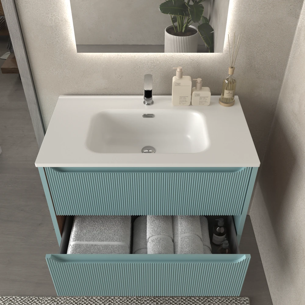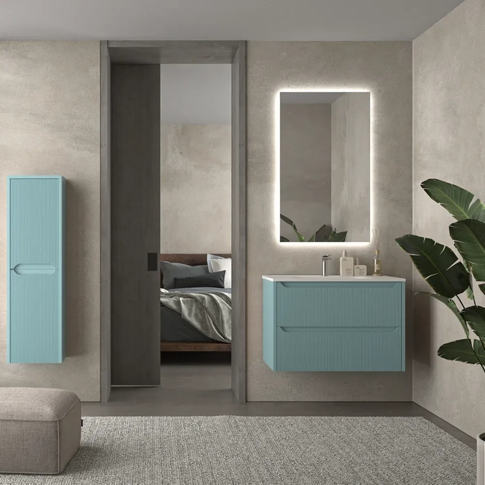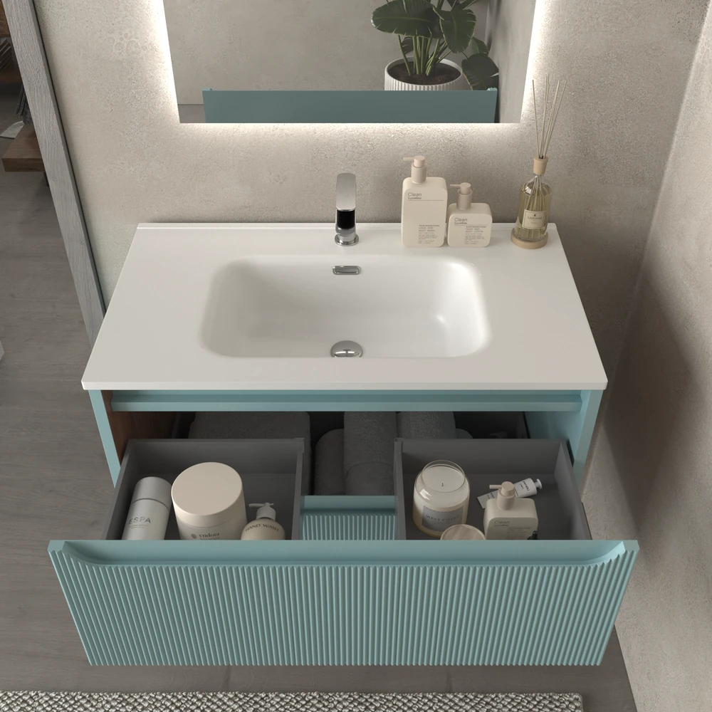 Mueble de baño suspendido 2 cajones TOSCANA con lavabo porcelana acabado millerigue TURQUESA