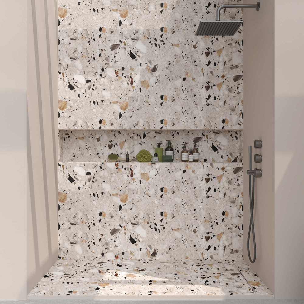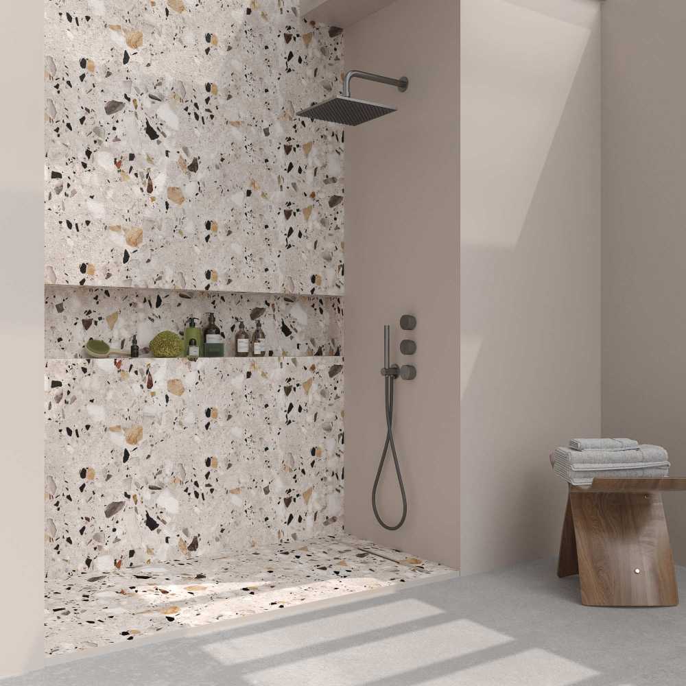 Panel de revestimiento para paredes de baño con material MSCOMPACT laminado de alta presión (HPL) con un espesor de 4 mm, según EN438 .El nucleo esta compuesto por láminas de papel kraft impregnadas con resinas termoendurecibles.La superficie de ambas caras es de papel impregnado con resinas termoendurecibles aminoplásticas .Todas las capas se unen medidante un proceso de alta presión y alta temperatura para obtener un material homonogéneo de alta densidad. Es CGS hidrofugo y CFG ignofugo.Panel de fácil instalación y limpieza.Producto ecológico , hecho con materiales sostenibles. Características :