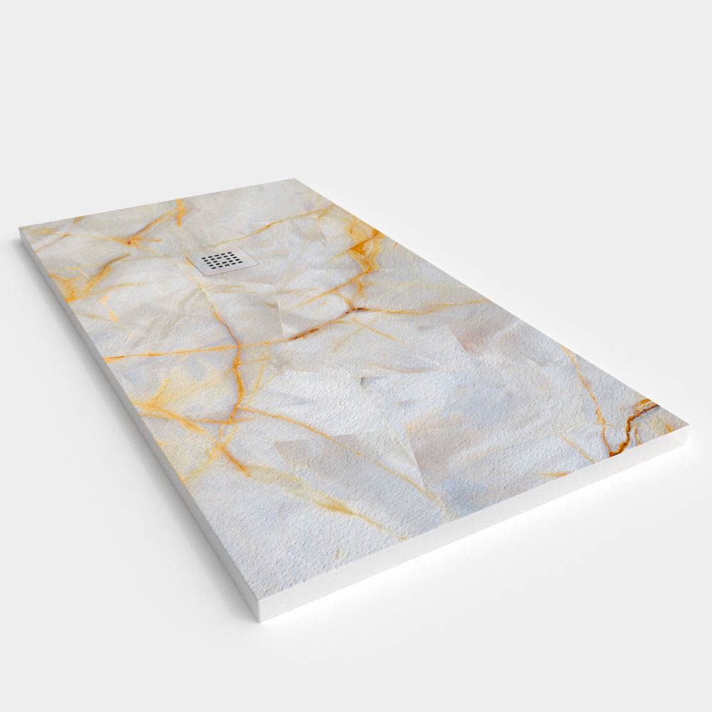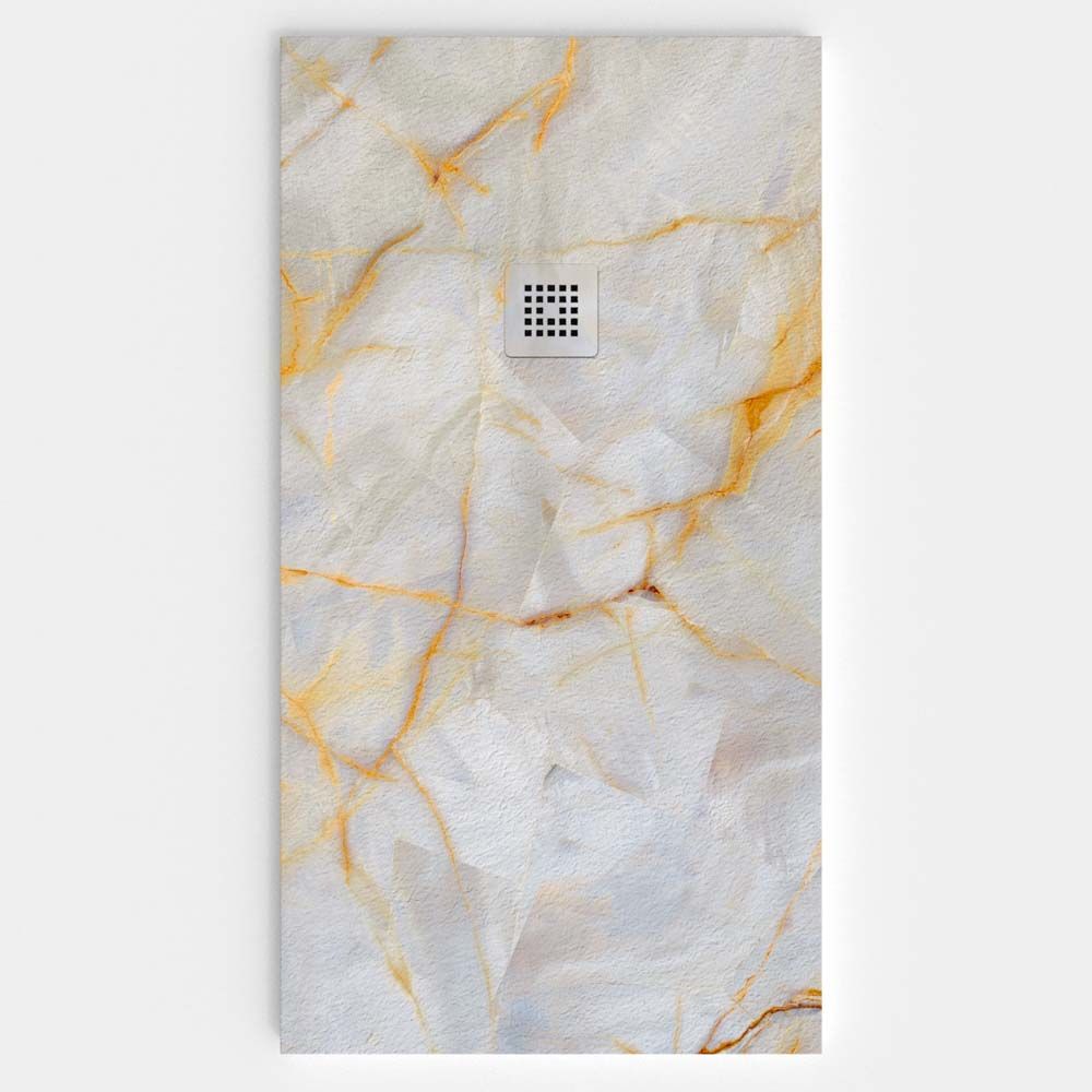El plato STONE 3D esta  fabricado de resina y cargas minerales. El revestimiento está realizado con Gel-Coat lo cual hace que la superficie del plato sea no porosa, es decir, nula absorción de agua lo que ayuda a que el plato no presente moho con el paso del tiempo. Esta composición le otorga al plato un grosor de 3 cm con un tacto cálido y agradable.Una línea diferente y creativa ya que simula el acabado del mármol en diversos colores.El plato de ducha se puede fabricar a medida . El acabado diversos colores otorgará a tu baño un ambiente natural y agradable diferente a lo que ya habías visto. Se realiza sobre una base de masa coloreada en los tonos de nuestra carta de color que más se adecúe al diseño, a la que se aplica en la cara superior  un sistema de digitalización propio, un diseño que ofrece infinitas posibilidades de personalización y de durabilidad garantizada gracias a su recubrimiento con GEL COAT.Es un plato de ducha con textura pizarra pero con con un nivel de antideslizamiento C3 el mas alto del mercado. Es muy resistente a golpes y rayado con una dureza en la escala Barcol de 45. Resistencia altas temperaturas. Este plato te durará toda la vida.Una de las notas importante del plato es que su superficie es antibacteriana ya que está realizado con agentes químicos que impiden que los hongos permanezcan en la superficie.En el precio está incluido la válvula 90 y rejilla del mismo acabado que el plato de ducha sin coste adicional.PODEMOS FABRICAR CUALQUIER DISEÑO, CONSULTANOS.Características: