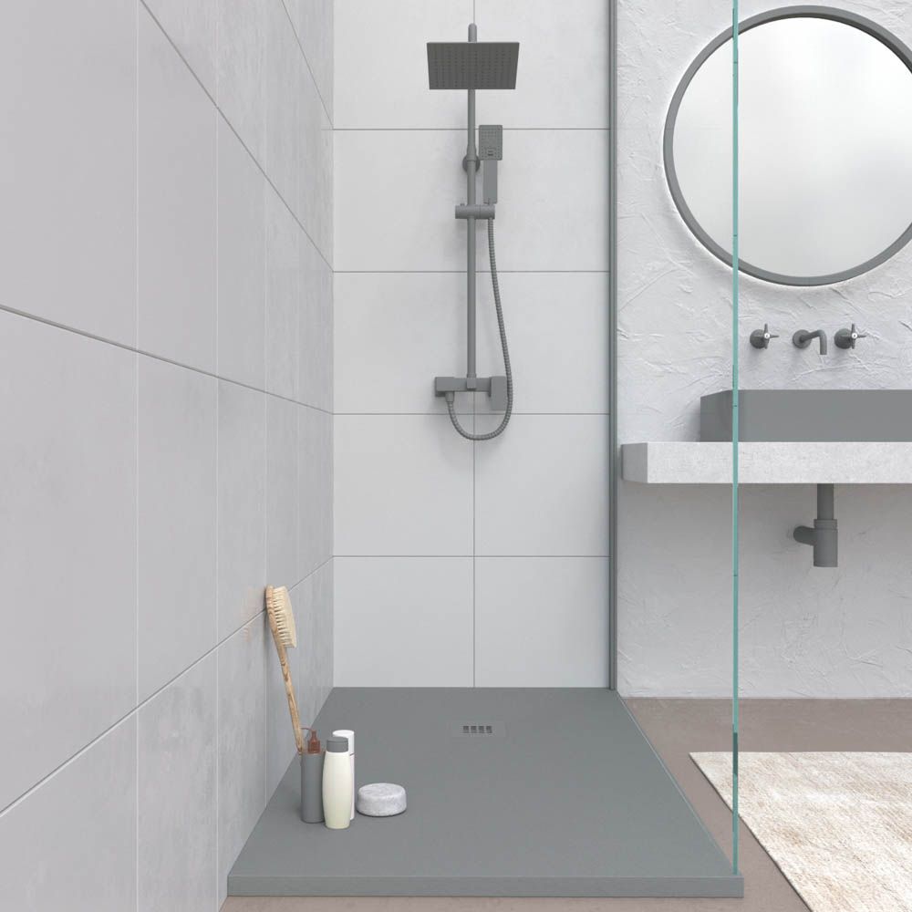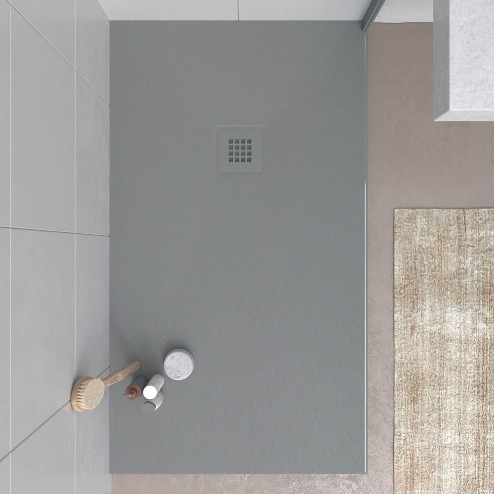 Plato ducha resina CLOE Gris Polvo RAL 7037 con textura pizarra antibacteriano y antideslizante. Rejilla termolacada
