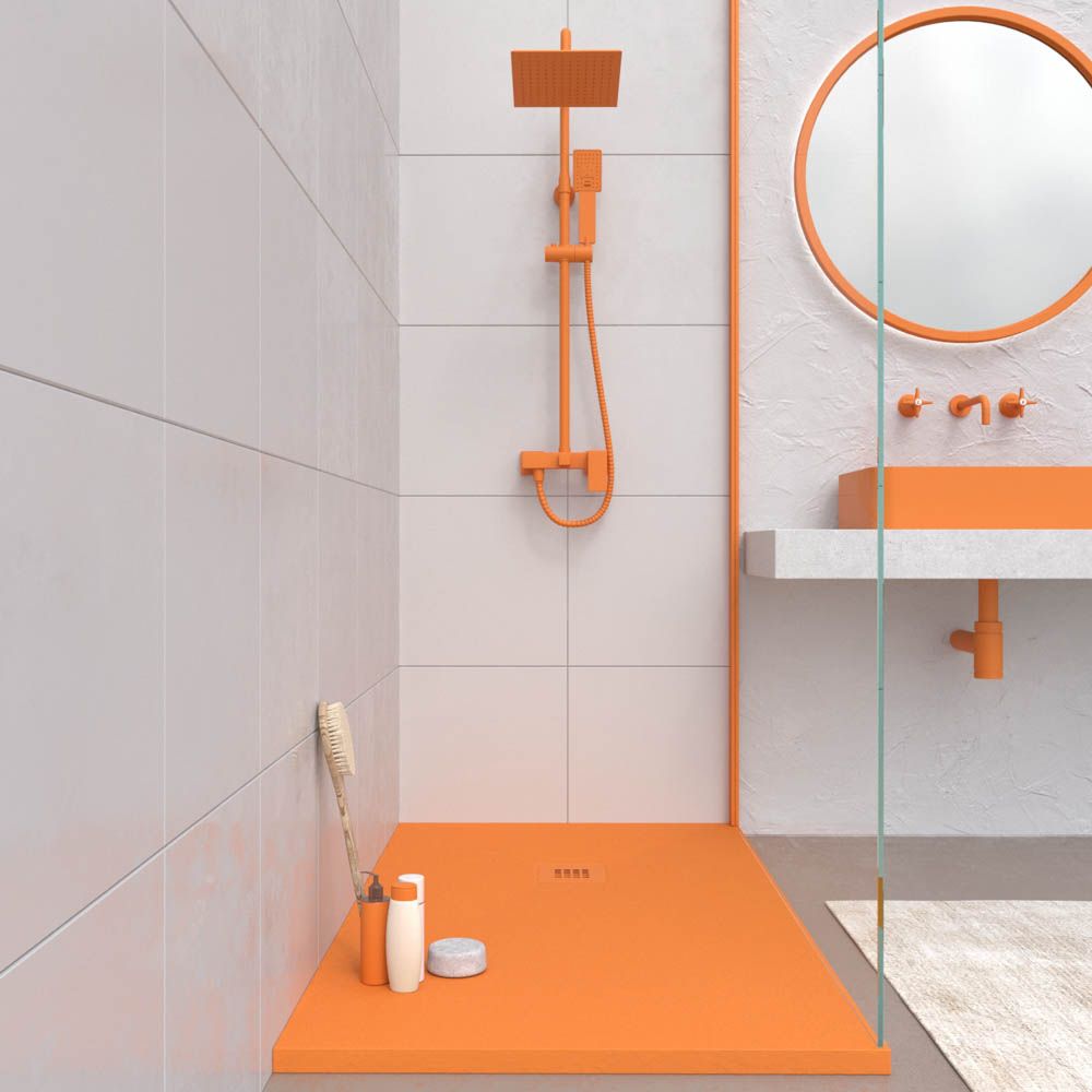 Plato ducha resina CLOE Pastel Naranja RAL 2003 con textura pizarra antibacteriano y antideslizante. Rejilla termolacada