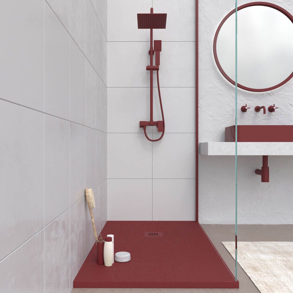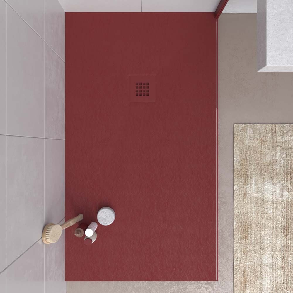 Plato ducha resina CLOE Rojo viejo RAL 3011 con textura pizarra antibacteriano y antideslizante. Rejilla termolacada